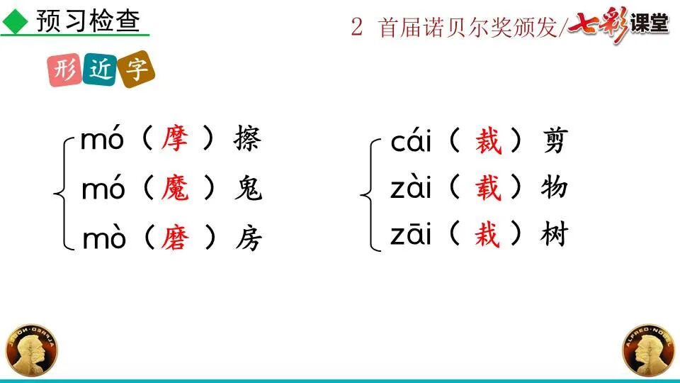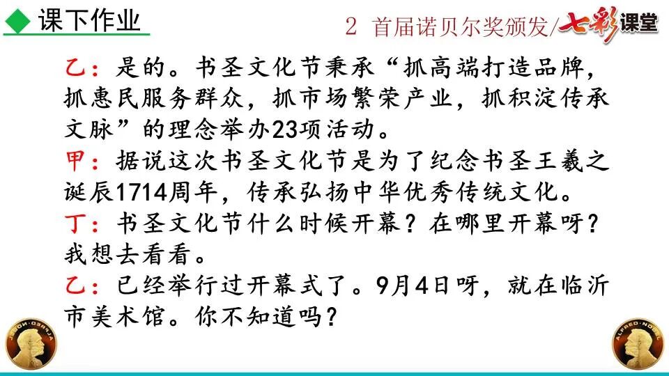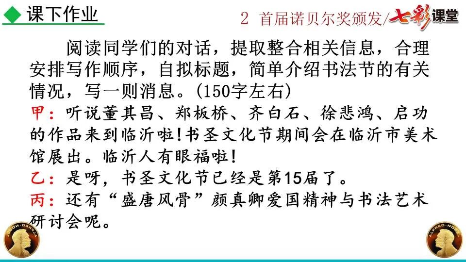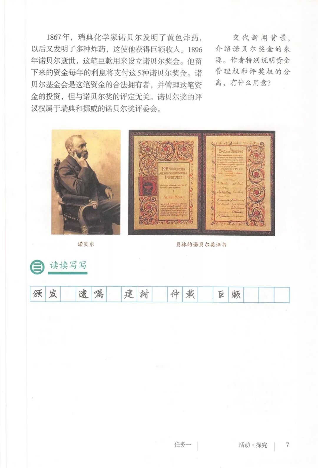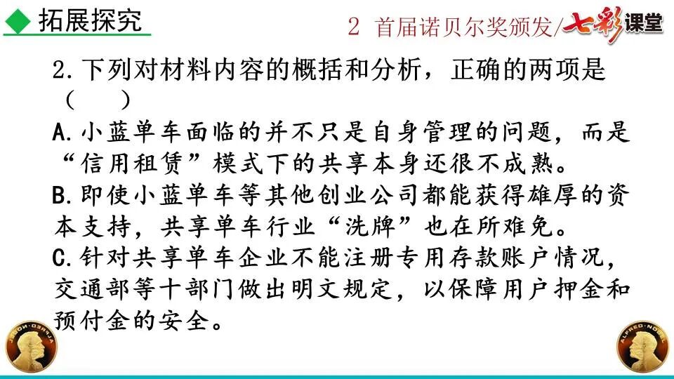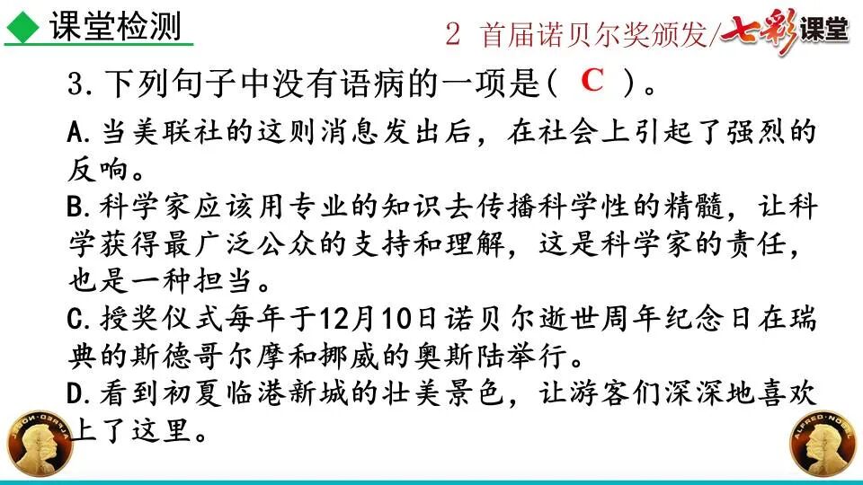 第一部分:( )简单概括了新闻所报道的主要内容及诺贝尔奖的由来。第二部分:( )报道了当年诺贝尔奖的获得者以及有关诺贝尔奖的知识。 1. “路透社斯德哥尔摩1901年12月10日电”属于什么内容?有什么作用?( ):人在生前或临死前用口头或书面形式嘱咐身后事应如何处理A.本届中国戏剧梅花奖各场演出的上座率超高,显示出市民对传统戏剧的热情可见一斑。 B.有些科学家认为,转基因大米富含维生素A,可以有效改善发展中国家人们营养不良。 C.中国科技创新成果交流会永久落户羊城,这是广州加快建设国家创新型城市的硕果。 D.能否切实减轻学生课业负担,让他们快乐成长,是我国中小学教学工作的当务之急。 1.bān zhòng zhǔ é shèn chāo3. 第一部分:(1)简单概括了新闻所报道的主要内容及诺贝尔奖的由来。第二部分:(2-4)报道了当年诺贝尔奖的获得者以及有关诺贝尔奖的知识。1. 这是新闻的电头,交代了通讯社名称、发电地点、时间,表明消息材料真实可靠,报道及时。首句为新闻的导语部分,交代了事件的几个要素:人物、时间、事件,总括了新闻的内容,简洁明了,让读者一下子就明白了新闻所报道的具体内容。第二句交代了诺贝尔奖的来历及其具体分类和获奖条件,为读者普及了相关知识,便于读者更有效地读懂和了解新闻内容。3. 语段中一一列举了当年诺贝尔奖的各个门类的获奖者的国籍、姓名、所获得的奖项以及他们所做出的贡献,这些都充分体现了新闻内容的准确性和真实性。4. 交代了新闻背景,进一步介绍了诺贝尔奖奖金的来源,补充说明资金管理权与奖项评议权的分离,更有利于读者了解和认识诺贝尔奖,从而增强了新闻内容的真实性。