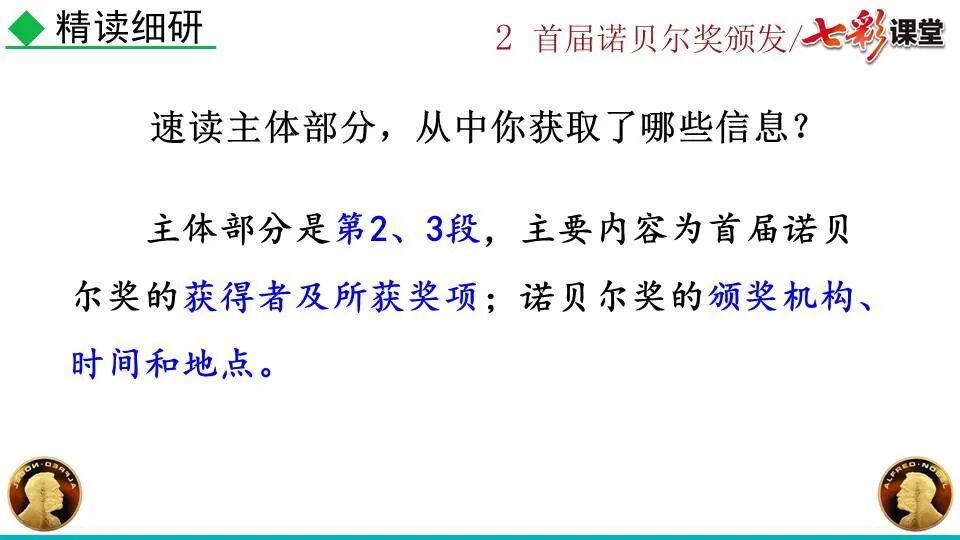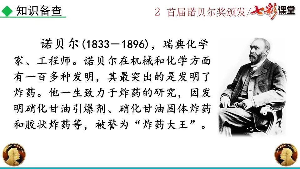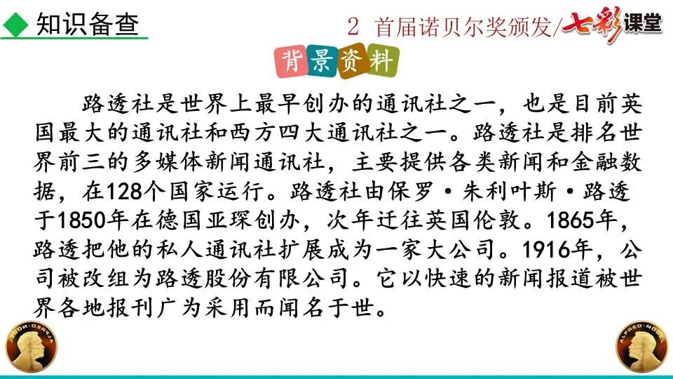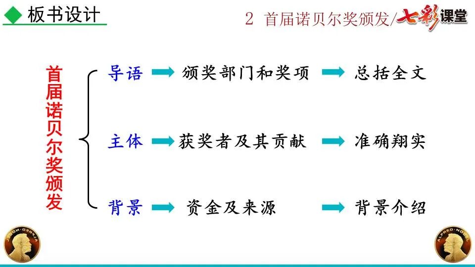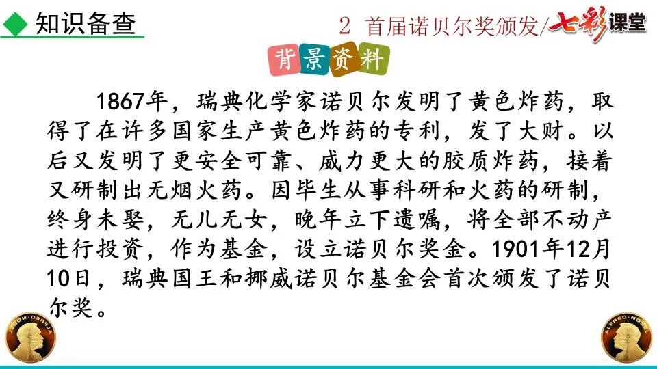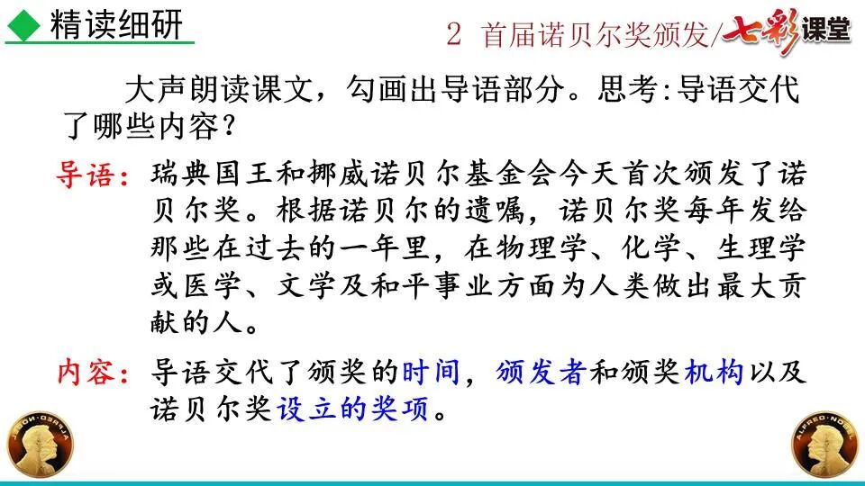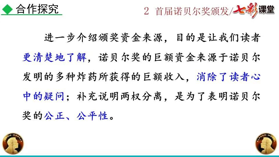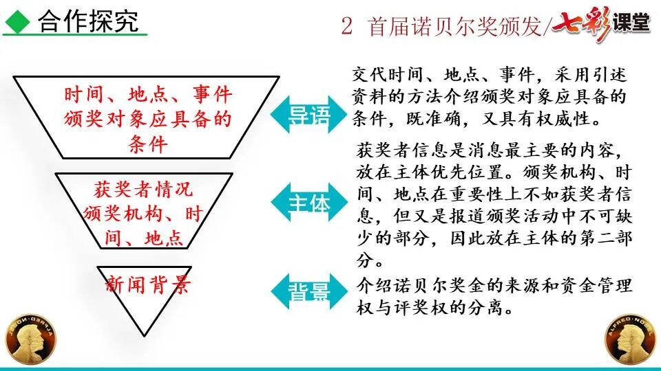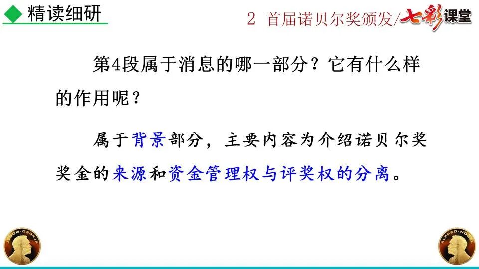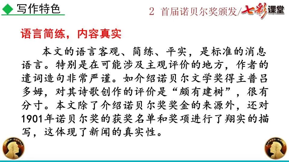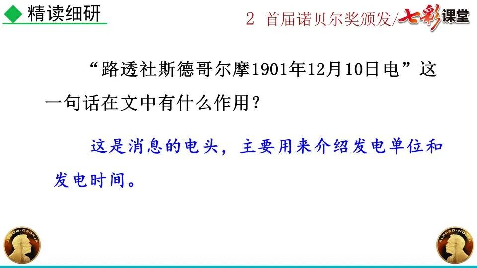 1860年诺贝尔开始研究硝化甘油,但在1864年工厂爆炸。为了防止以后再发生意外,诺贝尔将硝化甘油吸收在惰性物质中,使用比较安全。诺贝尔称它为达纳炸药,后获得专利。1875年诺贝尔将火棉(纤维素硝酸酯)与硝化甘油混合起来,得到胶状物质,称为炸胶,比达纳炸药有更强的爆炸力,他的这项发明也获得专利。他还有许多其他的发明,在橡胶合成、皮革及人造丝的制造方面都获有专利。诺贝尔经营油田和炸药生产,积累了巨大财富。根据诺贝尔的遗嘱,他逝世后将遗产大部分作为基金,每年以其利息(约20万美元)奖给前一年在物理学、化学、生理学或医学、文学及和平方面对人类做出巨大贡献的人士。这就是诺贝尔奖,于1901年第一次颁发。诺贝尔奖,是以瑞典著名的化学家、硝化甘油炸药的发明人诺贝尔的部分遗产(3100万瑞典克朗)作为基金在1900年创立的,于1901年首次颁发。诺贝尔奖现分设物理学、化学、生理学或医学、文学、和平、经济学六个奖项,以基金每年的利息或投资收益授予世界上在这些领域对人类做出重大贡献的人。第一部分(①):简单概括了新闻所报道的主要内容及诺贝尔奖的由来。第二部分(②-④):报道了当年诺贝尔奖的获得者以及有关诺贝尔奖的知识。1.“路透社斯德哥尔摩1901年12月10日电”属于什么内容?有什么作用?这是新闻的电头,交代了通讯社名称、发电地点、时间,表明消息材料真实可靠,报道及时。本题运用导语作用分析法。 首句为新闻的导语部分,交代了事件的几个要素:人物、时间、事件,总括了新闻的内容,简洁明了,让读者一下子就明白了新闻所报道的具体内容。第二句交代了诺贝尔奖的来历及其具体分类和获奖条件,为读者普及了相关知识,便于读者更有效地读懂和了解新闻内容。语段中一一列举了当年诺贝尔奖的各个门类的获奖者的国籍、姓名、所获得的奖项以及他们所做出的贡献,这些都充分体现了新闻内容的准确性和真实性。4. 第三自然段,作者交代了什么内容?有什么作用? 语段明确了诺贝尔奖的颁奖机构、颁奖时间和颁奖地点,使所报道的内容简洁明了,便于读者了解和掌握。语段交代了新闻背景,进一步介绍了诺贝尔奖奖金的来源,补充说明资金管理权与奖项评议权的分离,更有利于读者了解和认识诺贝尔奖,从而增强了新闻内容的真实性。这则消息以简洁明了的语言,报道了首届诺贝尔奖获奖的相关信息以及诺贝尔奖的有关知识,表达出了作者对诺贝尔及获奖者对人类贡献的高度赞美。《别了,钞票上的民族文化》这则消息采用简短的文字,报道了欧元统一后,各地区原有的钞票上的民族文化消失,取而代之的是小小的硬币上唯一的一个图案,表达出了作者对欧元钞票上民族文化消失现象的惋惜和痛心。 消息二则第2课《首届诺贝尔奖颁发》