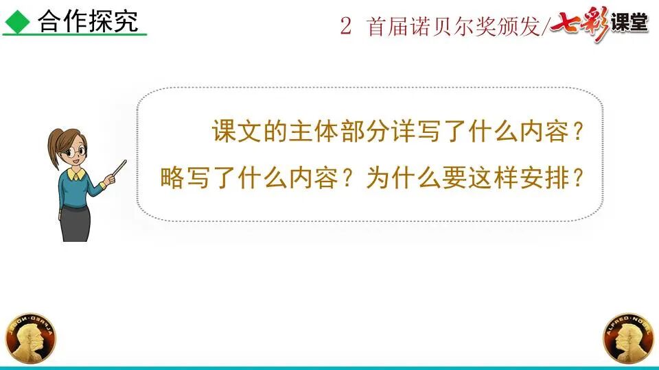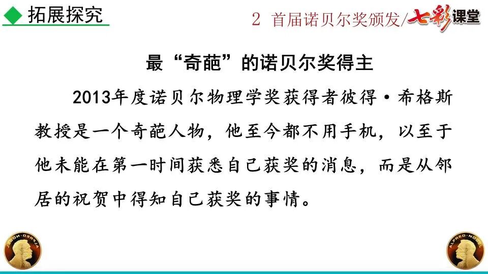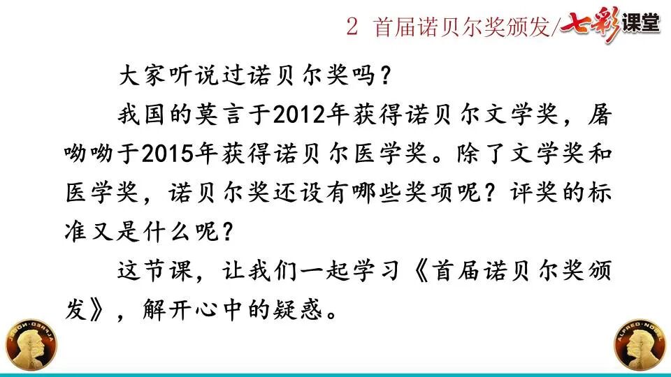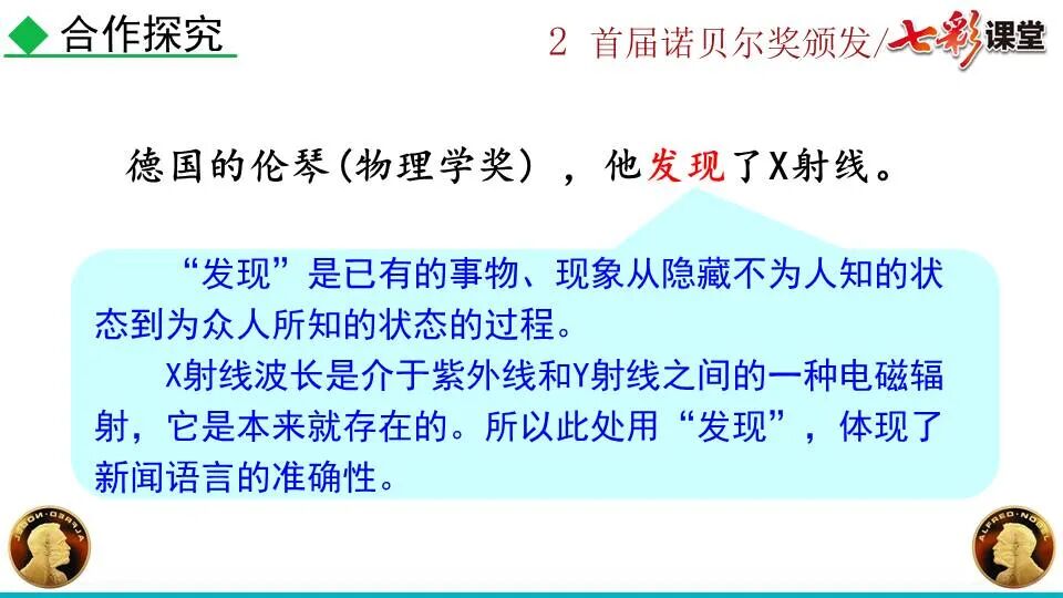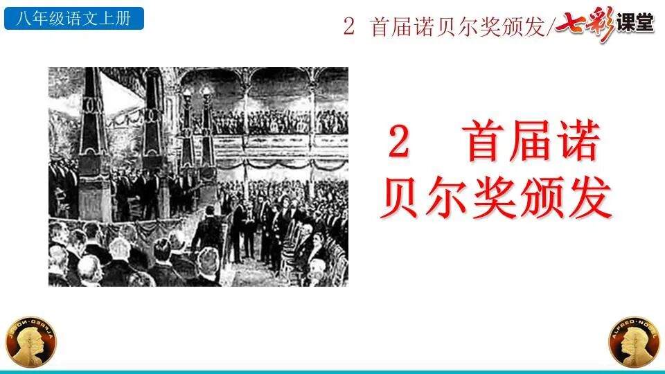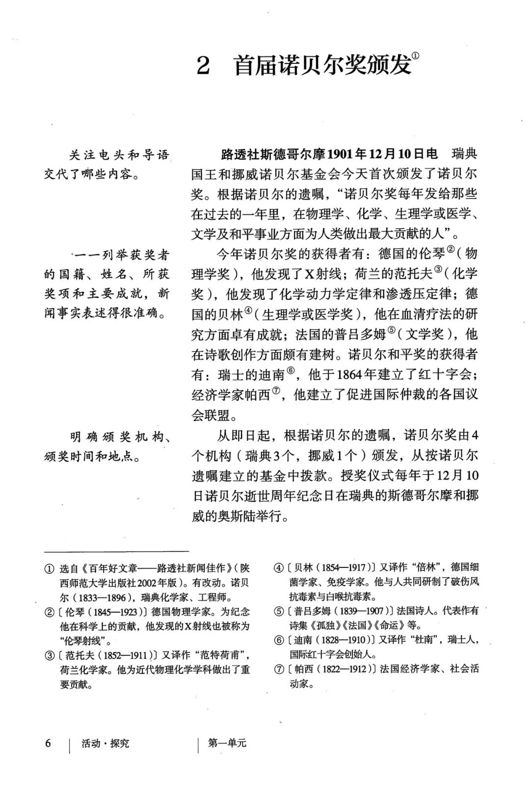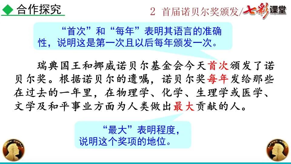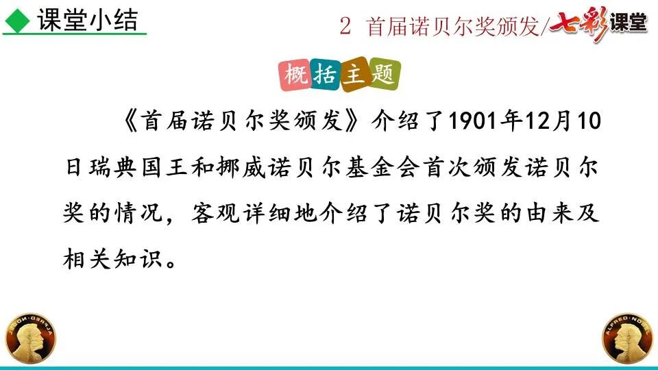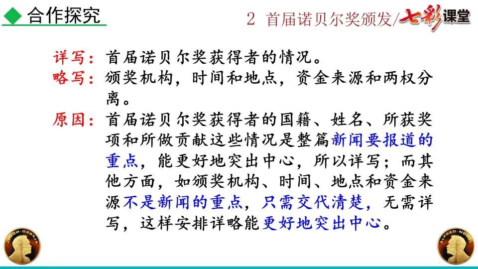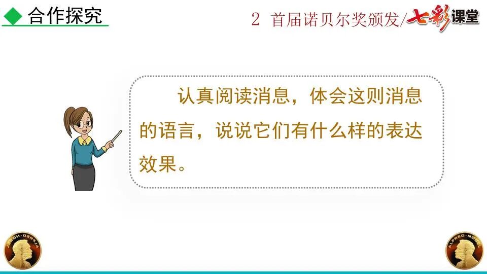 1860年诺贝尔开始研究硝化甘油,但在1864年工厂爆炸。为了防止以后再发生意外,诺贝尔将硝化甘油吸收在惰性物质中,使用比较安全。诺贝尔称它为达纳炸药,后获得专利。1875年诺贝尔将火棉(纤维素硝酸酯)与硝化甘油混合起来,得到胶状物质,称为炸胶,比达纳炸药有更强的爆炸力,他的这项发明也获得专利。他还有许多其他的发明,在橡胶合成、皮革及人造丝的制造方面都获有专利。诺贝尔经营油田和炸药生产,积累了巨大财富。根据诺贝尔的遗嘱,他逝世后将遗产大部分作为基金,每年以其利息(约20万美元)奖给前一年在物理学、化学、生理学或医学、文学及和平方面对人类做出巨大贡献的人士。这就是诺贝尔奖,于1901年第一次颁发。诺贝尔奖,是以瑞典著名的化学家、硝化甘油炸药的发明人诺贝尔的部分遗产(3100万瑞典克朗)作为基金在1900年创立的,于1901年首次颁发。诺贝尔奖现分设物理学、化学、生理学或医学、文学、和平、经济学六个奖项,以基金每年的利息或投资收益授予世界上在这些领域对人类做出重大贡献的人。第一部分(①):简单概括了新闻所报道的主要内容及诺贝尔奖的由来。第二部分(②-④):报道了当年诺贝尔奖的获得者以及有关诺贝尔奖的知识。1.“路透社斯德哥尔摩1901年12月10日电”属于什么内容?有什么作用?这是新闻的电头,交代了通讯社名称、发电地点、时间,表明消息材料真实可靠,报道及时。本题运用导语作用分析法。 首句为新闻的导语部分,交代了事件的几个要素:人物、时间、事件,总括了新闻的内容,简洁明了,让读者一下子就明白了新闻所报道的具体内容。第二句交代了诺贝尔奖的来历及其具体分类和获奖条件,为读者普及了相关知识,便于读者更有效地读懂和了解新闻内容。语段中一一列举了当年诺贝尔奖的各个门类的获奖者的国籍、姓名、所获得的奖项以及他们所做出的贡献,这些都充分体现了新闻内容的准确性和真实性。4. 第三自然段,作者交代了什么内容?有什么作用? 语段明确了诺贝尔奖的颁奖机构、颁奖时间和颁奖地点,使所报道的内容简洁明了,便于读者了解和掌握。语段交代了新闻背景,进一步介绍了诺贝尔奖奖金的来源,补充说明资金管理权与奖项评议权的分离,更有利于读者了解和认识诺贝尔奖,从而增强了新闻内容的真实性。这则消息以简洁明了的语言,报道了首届诺贝尔奖获奖的相关信息以及诺贝尔奖的有关知识,表达出了作者对诺贝尔及获奖者对人类贡献的高度赞美。《别了,钞票上的民族文化》这则消息采用简短的文字,报道了欧元统一后,各地区原有的钞票上的民族文化消失,取而代之的是小小的硬币上唯一的一个图案,表达出了作者对欧元钞票上民族文化消失现象的惋惜和痛心。 消息二则第2课《首届诺贝尔奖颁发》