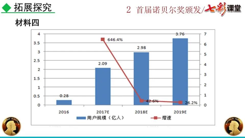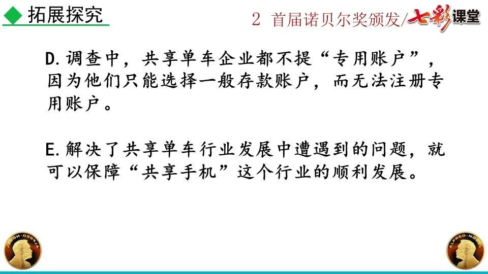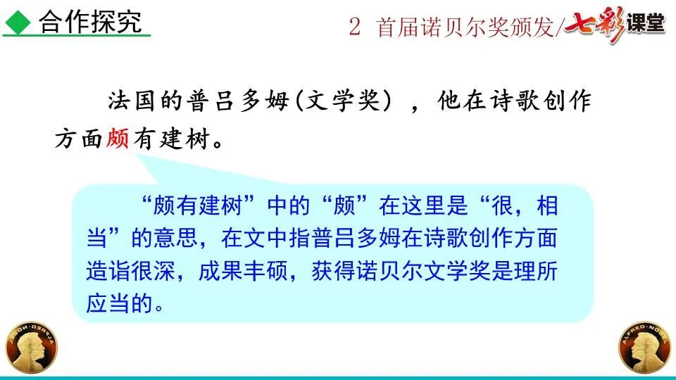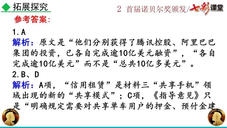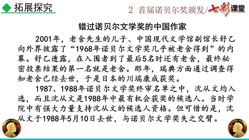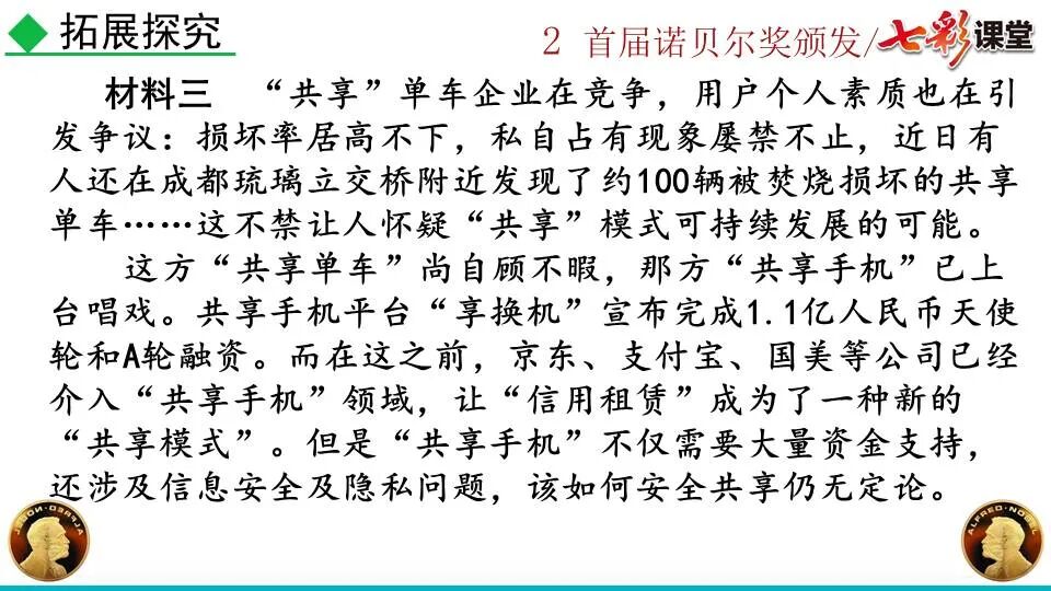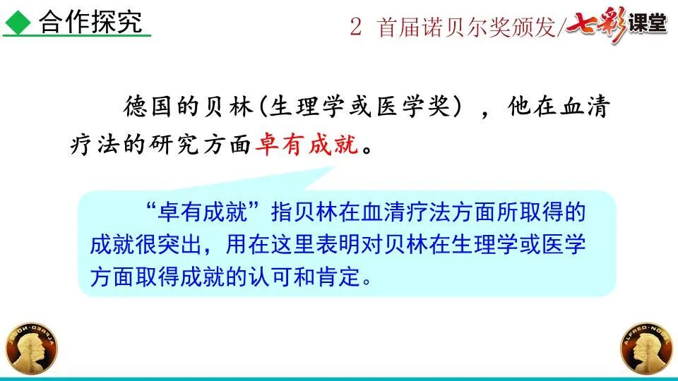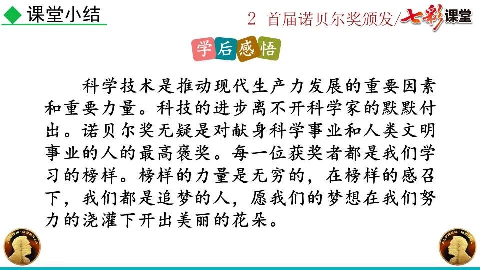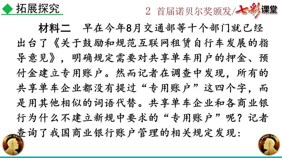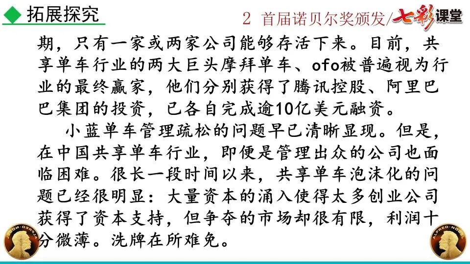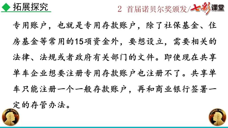 1860年诺贝尔开始研究硝化甘油,但在1864年工厂爆炸。为了防止以后再发生意外,诺贝尔将硝化甘油吸收在惰性物质中,使用比较安全。诺贝尔称它为达纳炸药,后获得专利。1875年诺贝尔将火棉(纤维素硝酸酯)与硝化甘油混合起来,得到胶状物质,称为炸胶,比达纳炸药有更强的爆炸力,他的这项发明也获得专利。他还有许多其他的发明,在橡胶合成、皮革及人造丝的制造方面都获有专利。诺贝尔经营油田和炸药生产,积累了巨大财富。根据诺贝尔的遗嘱,他逝世后将遗产大部分作为基金,每年以其利息(约20万美元)奖给前一年在物理学、化学、生理学或医学、文学及和平方面对人类做出巨大贡献的人士。这就是诺贝尔奖,于1901年第一次颁发。诺贝尔奖,是以瑞典著名的化学家、硝化甘油炸药的发明人诺贝尔的部分遗产(3100万瑞典克朗)作为基金在1900年创立的,于1901年首次颁发。诺贝尔奖现分设物理学、化学、生理学或医学、文学、和平、经济学六个奖项,以基金每年的利息或投资收益授予世界上在这些领域对人类做出重大贡献的人。第一部分(①):简单概括了新闻所报道的主要内容及诺贝尔奖的由来。第二部分(②-④):报道了当年诺贝尔奖的获得者以及有关诺贝尔奖的知识。1.“路透社斯德哥尔摩1901年12月10日电”属于什么内容?有什么作用?这是新闻的电头,交代了通讯社名称、发电地点、时间,表明消息材料真实可靠,报道及时。本题运用导语作用分析法。 首句为新闻的导语部分,交代了事件的几个要素:人物、时间、事件,总括了新闻的内容,简洁明了,让读者一下子就明白了新闻所报道的具体内容。第二句交代了诺贝尔奖的来历及其具体分类和获奖条件,为读者普及了相关知识,便于读者更有效地读懂和了解新闻内容。语段中一一列举了当年诺贝尔奖的各个门类的获奖者的国籍、姓名、所获得的奖项以及他们所做出的贡献,这些都充分体现了新闻内容的准确性和真实性。4. 第三自然段,作者交代了什么内容?有什么作用? 语段明确了诺贝尔奖的颁奖机构、颁奖时间和颁奖地点,使所报道的内容简洁明了,便于读者了解和掌握。语段交代了新闻背景,进一步介绍了诺贝尔奖奖金的来源,补充说明资金管理权与奖项评议权的分离,更有利于读者了解和认识诺贝尔奖,从而增强了新闻内容的真实性。这则消息以简洁明了的语言,报道了首届诺贝尔奖获奖的相关信息以及诺贝尔奖的有关知识,表达出了作者对诺贝尔及获奖者对人类贡献的高度赞美。《别了,钞票上的民族文化》这则消息采用简短的文字,报道了欧元统一后,各地区原有的钞票上的民族文化消失,取而代之的是小小的硬币上唯一的一个图案,表达出了作者对欧元钞票上民族文化消失现象的惋惜和痛心。 消息二则第2课《首届诺贝尔奖颁发》