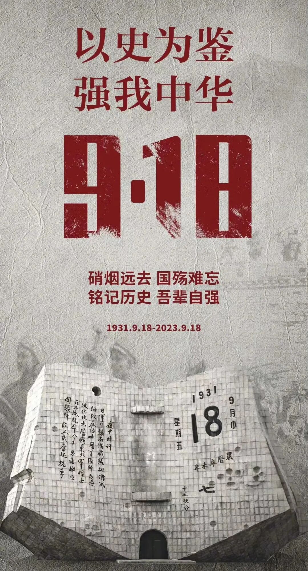 珍|视|和|平 警|钟|长|鸣 纪念918 勿忘国耻 铭记历史 珍爱和平 918纪念日 九一八事变,又称奉天事变、柳条湖事件,是1931年9月18日日本驻中国东北地区的关东军突然袭击沈阳,以武力侵占东北的事件。这一事件标志着日本帝国主义企图以武力征服中国的开端,也是中国人民抗日战争的起点。 历史背景 918纪念日 一战后,日本在华扩张受到了英美列强的遏制,中国的北伐战争使日本在华利益受到削弱,促使日本政府调整对华政策,加快吞并中国东北地区的步伐;20世纪30年代初,世界性经济危机发生,日本经济遭受沉重打击,陷入极端困境,并导致政治危机,在内外交困情况下,日本法西斯势力决意冲破华盛顿体系对日本的束缚,趁英美忙于应付危机,蒋介石大规模“剿共”之际,夺取东北,以摆脱困境,并图谋争霸世界。 历史意义 01 二战序幕 “九一八”事变是20世纪30年代初期发生在中国东北的震惊中外的重大事件,它不仅是日本帝国主义妄图以武力征服中国的开始,也是法西斯国家在世界上点燃的第一把侵略战火,它的爆发标志着第二次世界大战序幕的揭开,也标志着世界反法西斯战争的开始。 02 社会转变 毛泽东指出:“自从一九三一年九一八事变日本帝国主义武装侵略中国以后,中国又变成了一个殖民地、半殖民地和半封建的社会。”九一八事变后中国社会性质和主要矛盾所不断发生的变化,一直持续到1945年9月日本战败投降,中日民族这个主要矛盾才得以解决。 03 民族团结抗日 九一八事变及时向全国人民敲起警钟,“中华民族到了最危险的时候!”越来越成为华夏儿女的共识。在民族危机感逐步加深的过程中,民族责任感也迅速提高,并付诸实践;许多爱国知识分子积极发表政见和主张,呼吁全国人民“彻底明了国难的真相!”“人人应视为与己有切肤之痛,以决死的精神,团结起来作积极的挣扎与苦斗”,广大民众和各界人士以各种形式积极投身抗日救亡运动。 国共两党是当时中国的两大政党,九一八事变后,随着中华民族的空前觉醒,民族团结也日益增强,两党的民族使命感迅速增强,有力的促进了两党的再次合作,从东北地区到西北地区,最后发展到全中国,终于开创了团结御侮,共同抵抗日本帝国主义的侵略的新局面,实现了民族大团结。 致敬先烈 “9.18”,是国耻日,也是中华民族觉醒日。中华民族在这一天彻底觉醒,经过14年不屈不挠的惨烈抗战,中国人民最终赢得了抗击日本帝国主义侵略的伟大胜利,让和平的阳光再次普照大地。 面对残暴的侵略者,英勇顽强的中国人民从来不曾低下高昂的头!杨靖宇、赵尚志、赵一曼、八女投江……每一个名字背后,都是可歌可泣的诗篇。最恶劣的条件,最艰苦的斗争,白山黑水间,他们用自己的血肉,筑成中华民族不倒的长城。让我们向先烈致敬!岁月无疆,英雄不朽!![]()