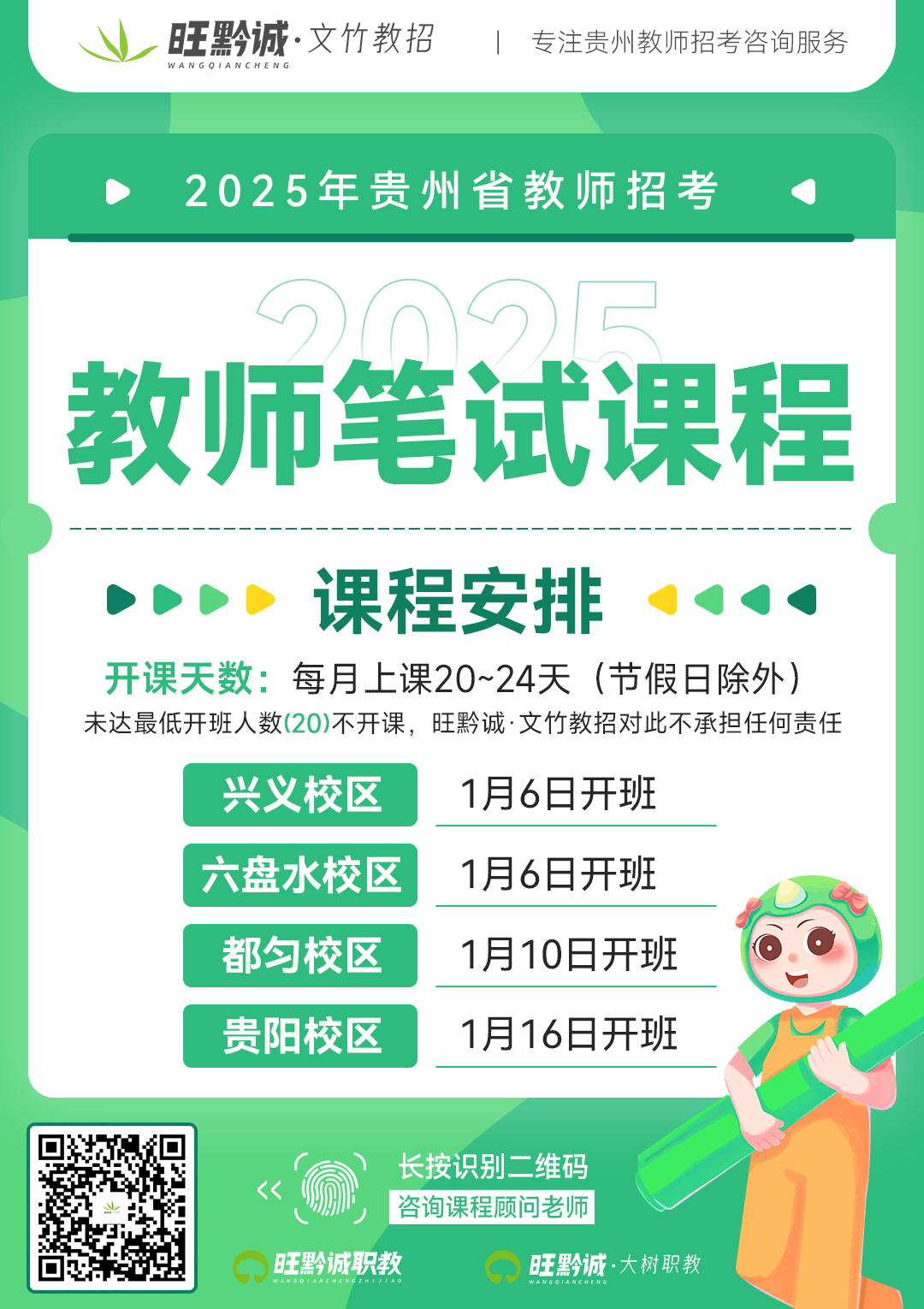 2025年想考教师的小伙伴想建议提前系统学习知识点,打好基础,这样后续有招考就可以考前复习一下就去参加~如贵州事业单位联考D类中小学教师岗、贵阳教师招考、事业单位教师岗单独招考、特岗教师......也能想选择一个好岗位报考,不怕岗位竞争太大不好上岸~针对大家的学习需求,旺黔诚文竹教育开设有一年、两年笔试面试无限学,直至考上为止。旺黔诚·文竹职教教师招考笔试课程:都匀校区1月10日开课,贵阳校区1月16日开课。