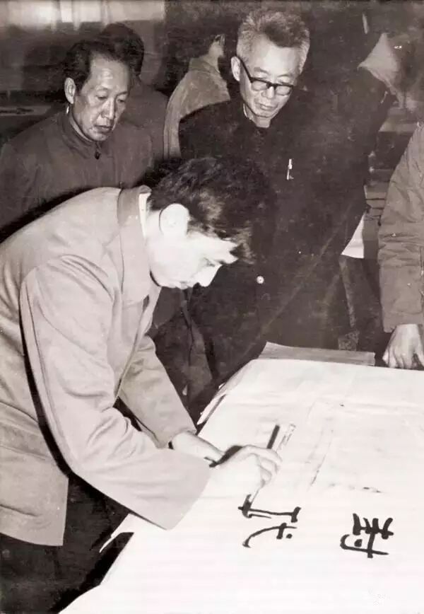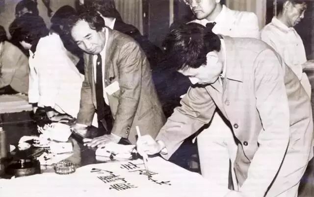 1981年,中日书法家在北大勺园交流。写字者为华人德,后右为沈鹏,左为柳倩。