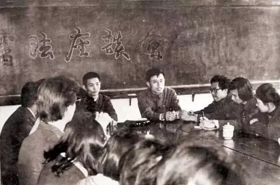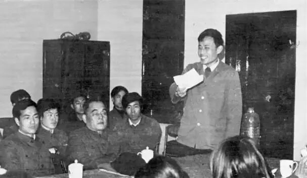 在北大书法社成立大会上,华人德(站立者)介绍筹备情况。前排正中为王路宾副校长,左为学生会主席潘维明。“看电影是书法社当时的一项重要活动。我和电教室主任关系很好,来了什么新片子、好片子,他都捎信给我,我就约五六个人过去看。书法社成立后,我对他讲,大学生很穷,也没钱出去旅游,希望他找一些与书法相关的风光片。他很快就弄来了关于泰山、华山的片子,还专门为书法社租了于右任书法、日本书法的影片。片子来了之后,由我通知五个人,这五个人每人再通知五个,那时候没有电话,都是口头通知,也挺方便。我毕业之后,杨松接任社长,第三任社长是余功保。后来的社长中,还有一个叫颜维琦的女孩儿,现在是《光明日报》记者,曾来苏州找过我。中文系七八级的刘晓峰,与潘维明、刘震云同班,他当时是学生会的宣传部长,留校从政,后来下到格尔木当过市长。他见我时还开玩笑:‘老华,书法社那些弟兄们,与你感情深啊!大家一见面,开口老华怎么样,闭口老华怎么样,我真妒忌你!”