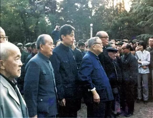 铜像落成典礼后,许德珩(中)亲切勉励北大师生。右一为北大党委副书记马石江,右二为潘维明,左一为华人德。