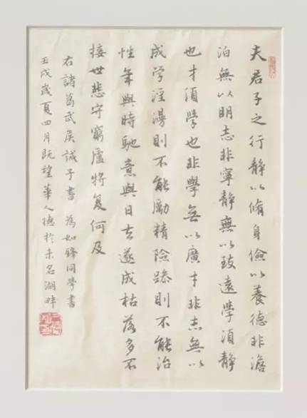 华人德说:“2005年3月,我夫妇到美国尼亚加拉瀑布旅游,住在徐如锋家,居然看到她家墙上挂着我北大毕业时写的小行楷诸葛亮《诫子书》,还有一个更小的镜框,是我写的张孝祥词《念奴娇·过洞庭青草湖》。”我从白谦慎先生那里得到了徐如锋的信箱,她收到我的信很惊讶,当天就拍了照片给我,后来担心像素不足,又送到专业机构拍摄,特此致谢。北大书法社、北大书法研究社均成立于12月21日,这究竟是天意,还是巧合?华人德说:“北大书法社12月21日开成立会,是因为这天是星期日,学生没课。至于北大书法研究社为何也选择这一天,就不得而知了。1917年12月21日,北京大学书法研究社成立,公推薛祥绥、杨湜生为执事,聘请马衡、沈尹默、刘季平为导师。书法研究社成立之初,活动频繁,‘五四’以后,北大日刊上就没有书法研究社的通告、纪事了。后来,蔡元培辞职出走,学校管理一时无序,书法研究社无形中解散。北大书法研究社的这段历史,沈尹默先生《我和北大》《书法漫谈》《学书丛话》《六十余年来学书过程简述》《论书诗词》都没有提到,戴自中先生的《沈尹默先生年谱简编》也没有涉及。或许沈先生数十年后对这段历史已回忆不起,或许他认为对书法研究社作一些指导,是一个教师应尽的职责,不必着意记述。”