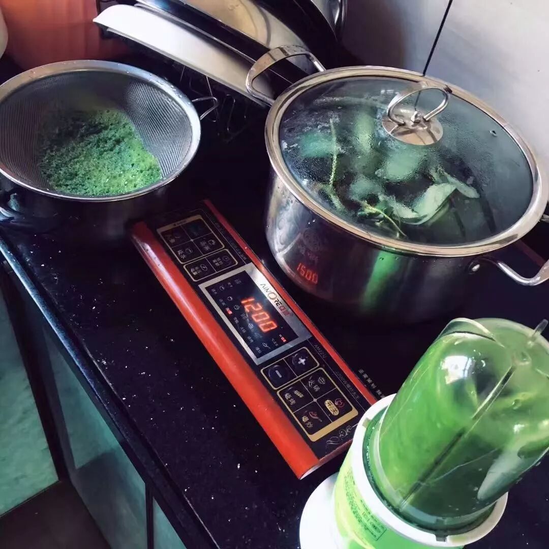 然后用搅拌机将鸡屎藤叶加水打成浆,再用锅煮开(可以先煮好再打)。