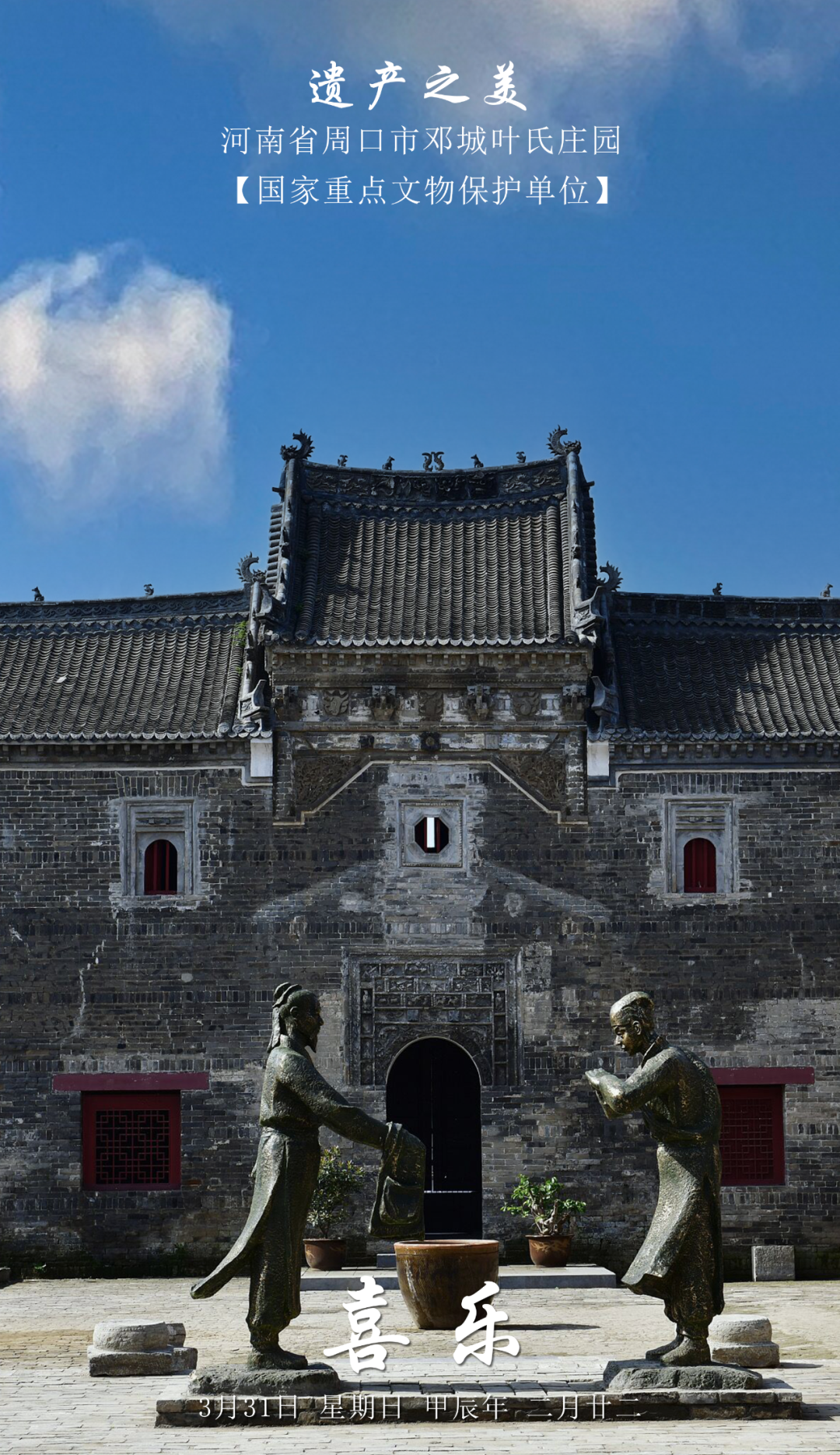 叶氏庄园 叶氏庄园位于商水县邓城镇,由当地依靠水运而发家的叶氏家族修建,始建于清康熙年间,到咸丰时形成了“三进堂楼院”“五门照”“高门台”三个大院为主的叶氏庄园建筑群,鼎盛时期占地达30亩,现存房屋160余间,建筑面积1980平方米。 叶氏庄园是目前保存较为完整、建筑规模较大的清代民间庄园之一,是北方较典型的四合院组群建筑,其砖雕、木雕、石雕等体现了清代中原民居建筑的艺术水平。叶氏庄园1986年被确定为省级重点文物保护单位,2013年被确定为全国重点文物保护单位。