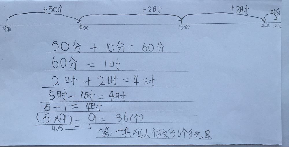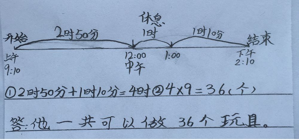 这位学生利用数线图1小时、1小时地数,一目了然地计算出经过时间是5小时,再减去休息的1小时,工作了4小时,4×9=36(个),共做了36个玩具。