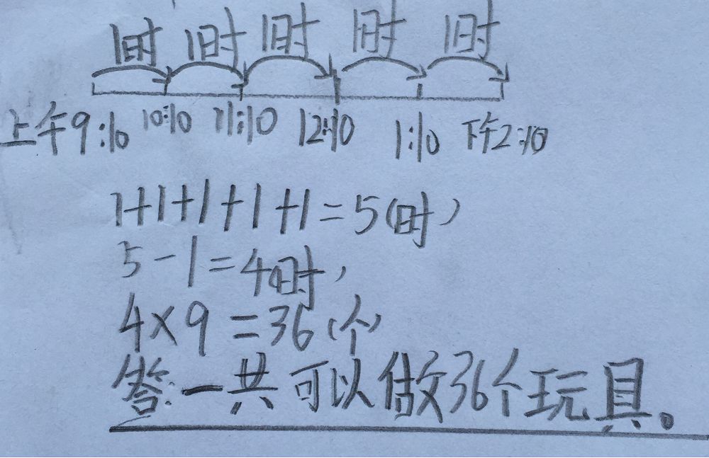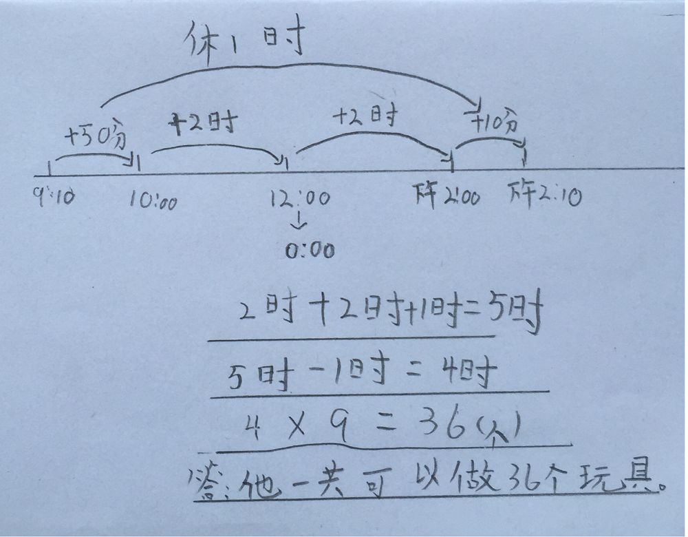 这道题有一定的难度,其一是对题意的正确理解:一共可以做多少个玩具,已知1小时做9个玩具,那么需要知道做了多少个小时,也就是求经过时间;其二是时间经过了中午的12时,这对一些学生可能会存在难度;其三是题目中的信息“中间休息1小时“可能会被学生忽视,最后导致结果出错。