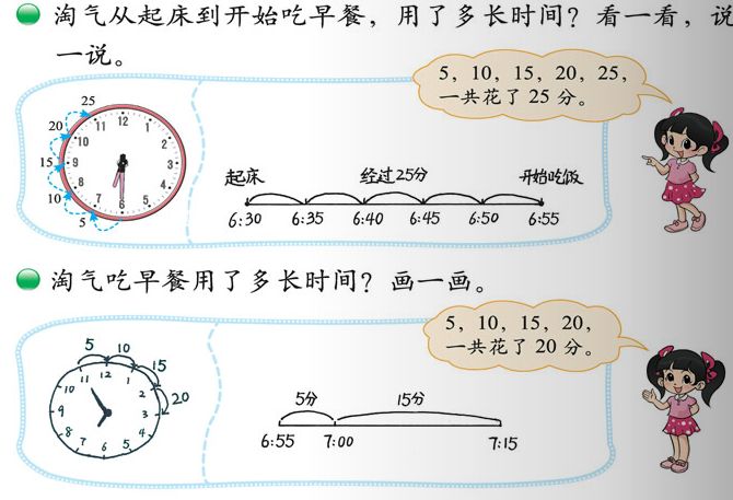 这两种方式都很直观,学生易于理解。对于画数线示意图的方法,课堂上我让学生在对话交流的基础上看懂数线图,并结合自己的理解动手画一画数线图,学生兴趣盎然,能将抽象的经过时间直观呈现在数线图上,轻松突破了教学难点。