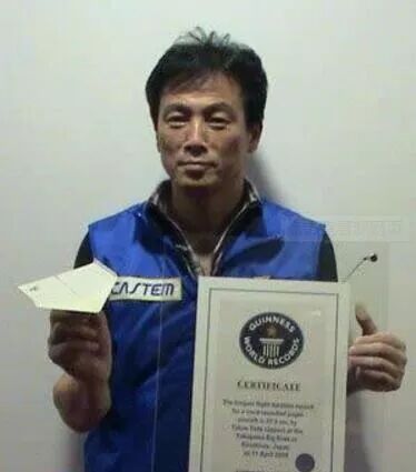 2009年4月,日本折纸飞机协会的主席户田拓夫创造了纸飞机的飞行时间新的世界纪录:27.9秒。户田拓夫把这架纸飞机叫做“空中之王”(Sky King),仅有一张纸折叠而成,整个过程未用胶水和剪刀。