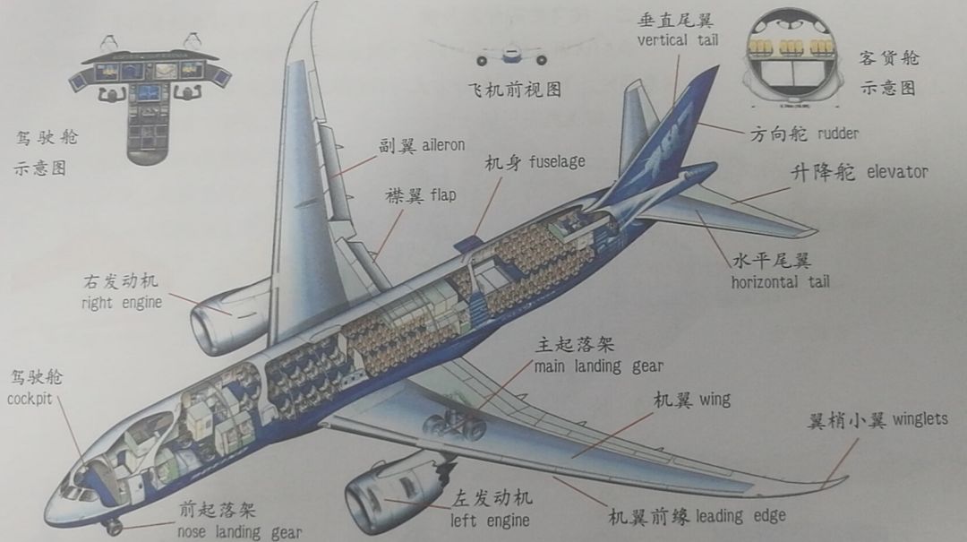 机身:把飞机各个部分连接起来,内部可乘坐人员,存储油料和货物等。