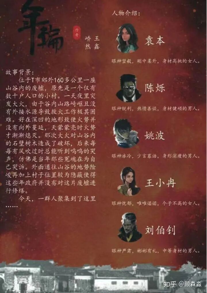 位于T市郊外160公里一座山谷内的废墟,原先是一个仅有数十户人口的小村。一天夜里突发大火,由于谷内山路崎岖且没有外接水源,导致救火工作极其困难。好在深凹的地形致使火势并没有向外蔓延,天蒙蒙亮时火势才渐渐熄灭。那次大火对山谷内的石壁树木造成了破坏,后来每每有风吹过时总能听到呜呜的哭声,仿佛当年那些冤魂在为自己哭诉。外面通往山谷的地势险峻,再加上村子位置较为隐蔽使得这些年政府并没有对这片废墟进行修缮。 年轮剧本杀
