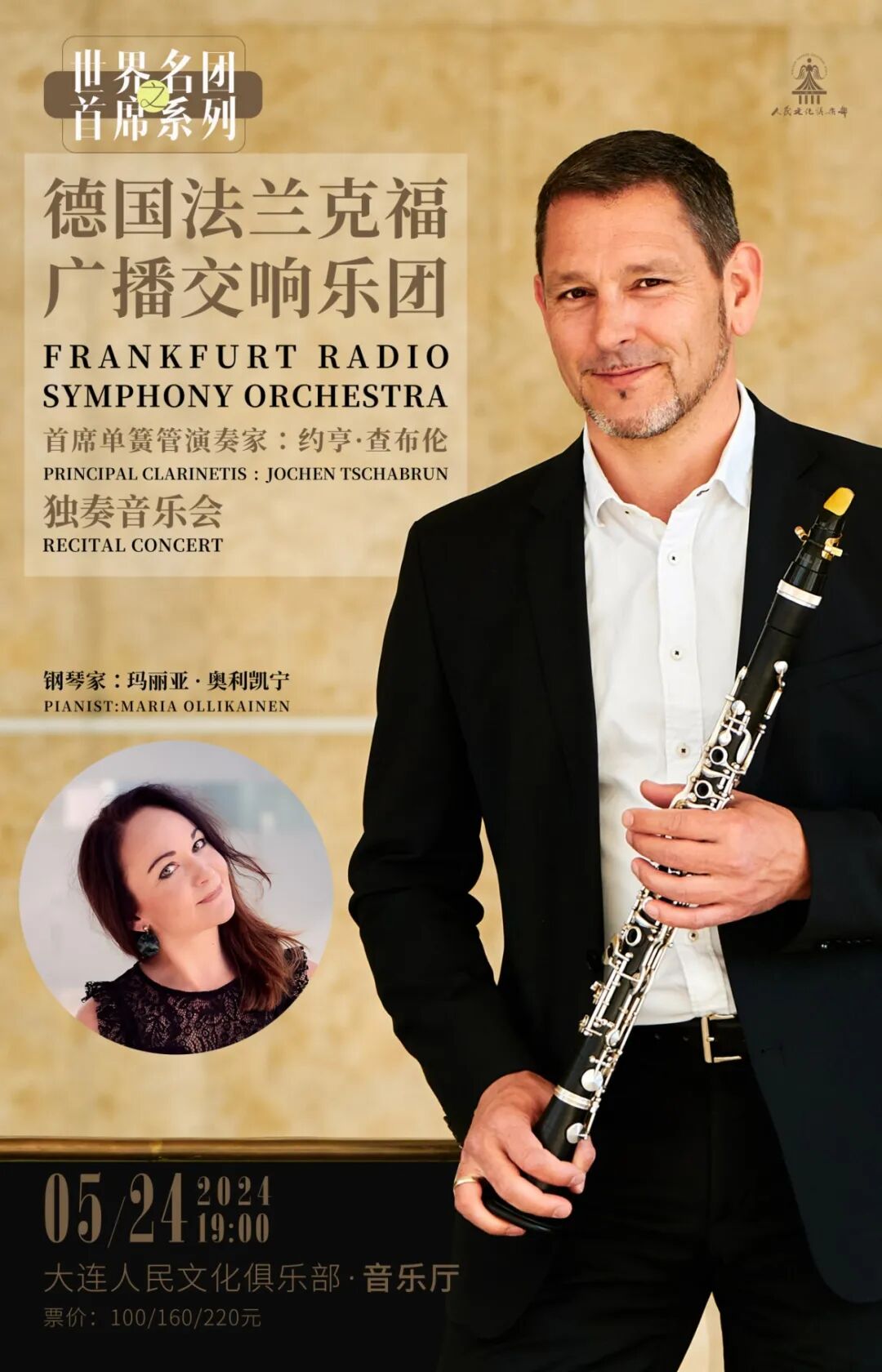 首席单簧管演奏家:约亨·查布伦 独奏音乐会 单簧管 ?法兰克福广播交响乐团 单簧管首席:约亨·查布伦 约亨·查布伦1974年出生于德国的菲林根。八岁时在特罗辛根的青年音乐学校上了他人生的第一堂单簧管课。他在德国和奥地利的青年音乐大赛(Jugend Musiziert)比赛中多次获得一等奖。在比赛中,他作为单簧管独奏家与巴登符腾堡州青年管弦乐队合作,并收获莱昂贝格音乐大奖。他曾是德国国家青年交响乐团和马勒青年管弦乐团成员。 约亨·查布伦是一位广受欢迎的室内乐演奏家,是Antares组合的创始成员。他还与德国著名演员合作,包括Udo Wachtveitl, Wolfram Koch, Ulrich N?ten 和Christoph Waltz等。 约亨·查布伦多次在德国、日本举办大师课,与法兰克福广播交响乐团、福拉尔贝格州立交响乐团、汉诺威广播爱乐乐团合作演出莫扎特、施波尔、波札和弗朗赛的作品。 他曾多次作为独奏单簧管演奏家与柏林爱乐乐团、巴伐利亚广播交响乐团、慕尼黑爱乐乐团、汉堡北德广播交响乐团、西德广播交响乐团、莱比锡布商大厦管弦乐团、马勒室内管弦乐团、德累斯顿国家管弦乐团等乐团共同演出。 钢琴 ?钢琴玛丽亚·奥利凯宁 玛丽亚·奥利凯宁出生于芬兰,1995年毕业于西贝柳斯音乐学院。之后来到德国继续深造。她师从俄罗斯钢琴大师拉扎尔·贝尔曼,并于2001年毕业于魏玛李斯特音乐学院。 作为一名教育家,玛丽亚·奥利凯宁于2001年至2015年期间在魏玛、卢塞恩和美因茨音乐学院工作,并多次举办大师班。2007年,她在德国音乐委员会的比赛中被授予乐器合作伙伴奖。 自2016年以来,玛丽亚·奥利凯宁一直是德国法兰克福广播公司的钢琴家。在2020年春季疫情期间,玛丽亚·奥利凯宁担任西德广播七号舞台直播系列节目的钢琴家,该系列节目仍然可以在 youtube 上观看。 除了室内乐演奏外,她也为很多歌唱家担任伴奏,包括 Paula Murrihy,Tanja Ariane Baumgartner和 Louise Alder等。 不仅如此,玛丽亚·奥利凯宁还是法兰克福歌剧院交响学院负责人。 ?演出曲目 海因里希·贝尔曼 柔板第三首 作品号23 Heinrich B?rmann: Adagio (from Clarinet Quintet no. 3 op.23) 舒曼:幻想小曲集 作品号73 Robert Schumann: Fantasy pieces op. 73 for clarinet and piano 海因里希·贝尔曼:随想曲的,单簧管独奏 Heinrich Sutermeister: Capriccio for clarinet solo 弗朗西斯·普朗克:单簧管与钢琴奏鸣曲 Francis Poulenc: Sonata for clarinet and piano ---------中场休息--------- 圣桑:单簧管与钢琴奏鸣曲 作品号 167 Camille Saint-Sa?ns: Sonata for clarinet and piano op. 167 贝多芬:丢失一分钱的愤怒,钢琴独奏 作品号129 Ludwig van Beethoven: Rage over a lost penny op.129 for piano solo 勃拉姆斯:单簧管奏鸣曲第二首,作品号120 Johannes Brahms: Clarinet Sonata op.120 no.2 *演出曲目及顺序以现场为准 单簧管独奏 演出时间 | Time 2024年5月24日 19:00 地点 | Venue 大连人民文化俱乐部音乐厅 票价 | Ticket Price 100/160/220元 (可使用惠民卡兑换此场演出门票) 温馨提示 *本场演出1.2米以下儿童凭票入场 *由于安保和版权的原因,大多数演出、展览及比赛场所禁止携带食品、饮料、专业摄录设备、打火机等物品,请您注意现场工作人员和广播的提示,予以配合。