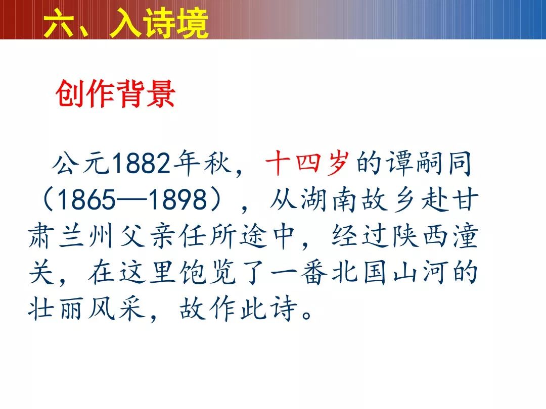 14岁的谭嗣同面临的祖国正是一个软弱无力,被列强随意欺凌的国家。谭嗣同对此深感愤慨,在随父上任的途中已经是满腔热情渴望为民族国家争取光荣,面对北方的壮阔山水,感觉跟自己的那种冲破罗网、勇往直前、改造国家命运的心情相似,移情于物,写下了这首诗。