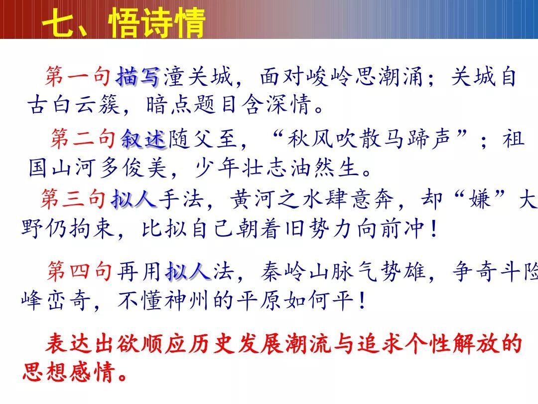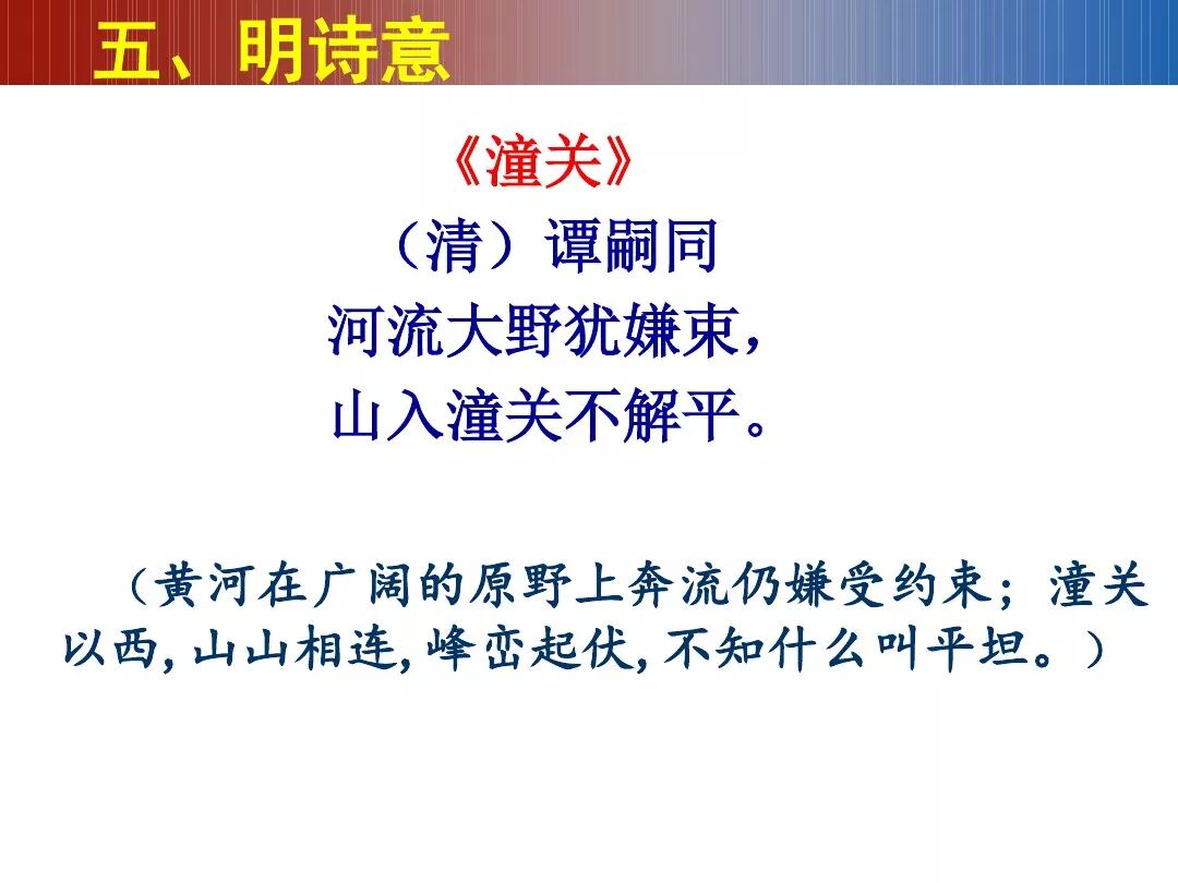 接下来的三、四句,则转从河和山方面来写。在前面那种状态下,诗人极目四望,眼前的自然景物也呈现出新奇的姿态:那从群山中冲决而出的黄河,尽管已奔入辽阔的平原,但仍嫌受束缚似的在不断冲击着河岸;而西去的群山,虽然走向与黄河相反,但仿佛也在力戒平坦,一更比一峰高。这样透过壮阔险峻的背景,就把潼关写活了。同时将写景与言情巧妙地结合起来,融进了诗人要求冲破约束的奔放情怀,是自我性格含蓄而又生动的描绘。