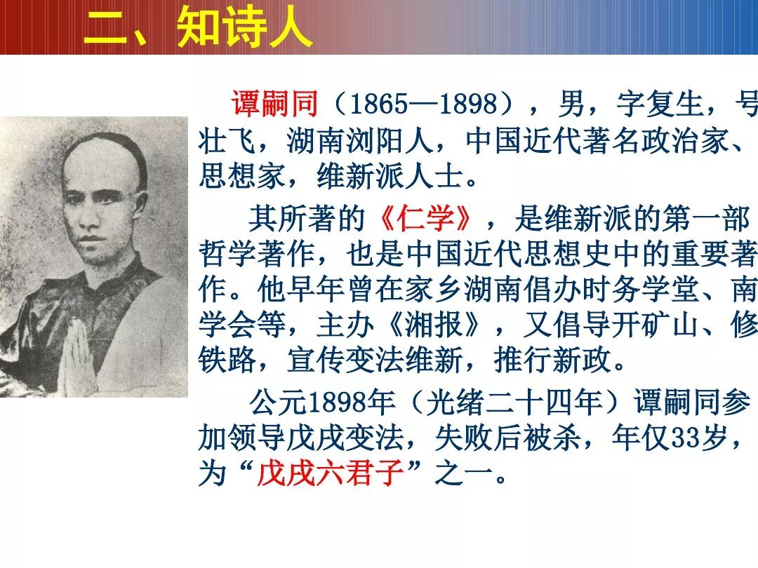 谭嗣同(1865—1898),字复生,号壮飞,湖南浏阳人。清末维新派政治家、思想家,戊戌变法“六君子”之一。中日甲午战争后,愤中国积弱不振,在浏阳倡立学社。遍历北京、上海、南京,吸收新学知识。1897年9月政变发生,被捕入狱,与林旭、杨锐、刘光第、杨深秀、康广仁等同时遇害,史称“戊戌六君子”。