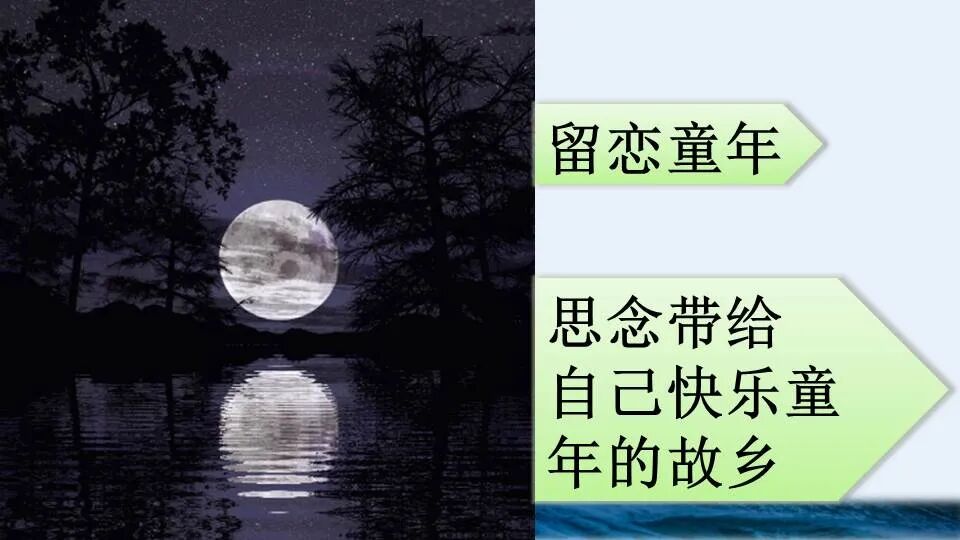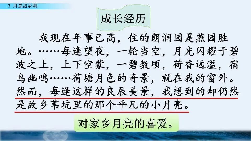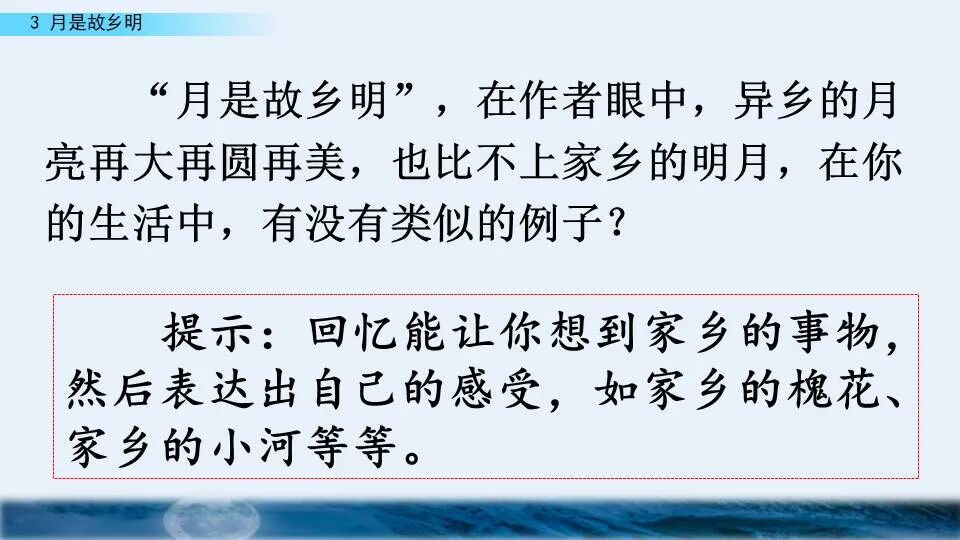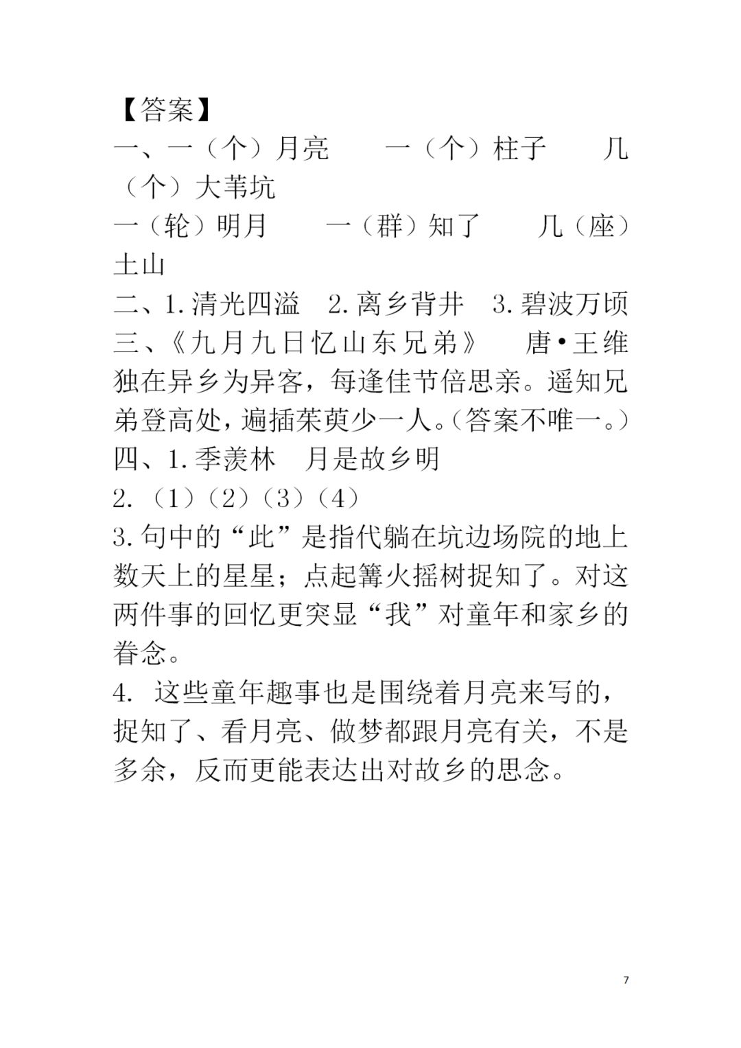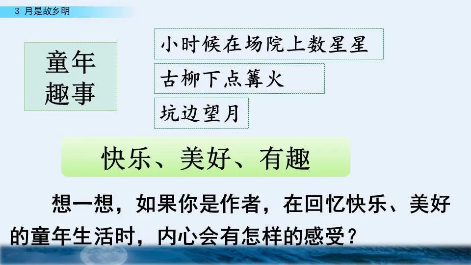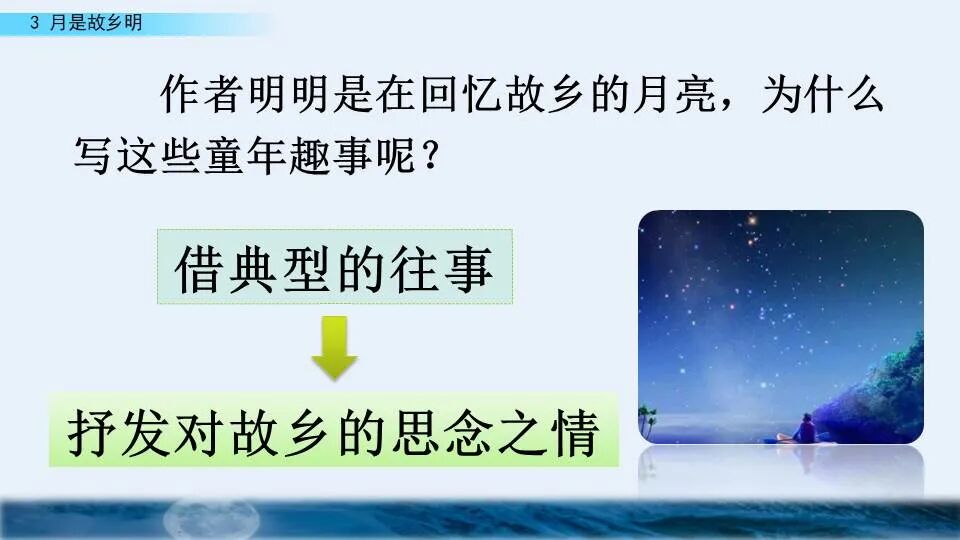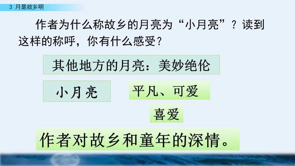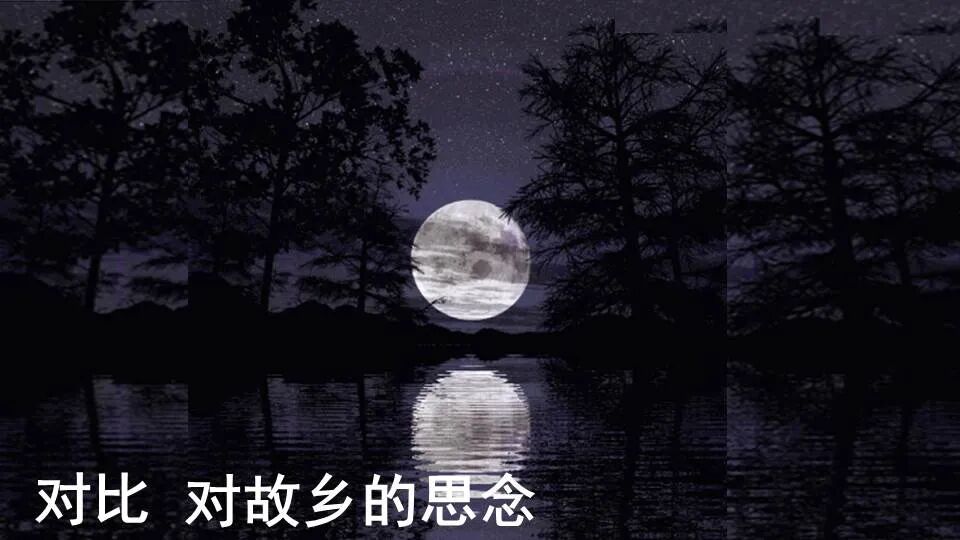 第二部分(2~6):写了月下故乡的山、水,以及离开故乡后在各地看到的月亮。答:①“月是故乡明”出自杜甫的《月夜忆舍弟》。 全诗为:“戍鼓断人行,边秋一雁声。露从今夜白,月是故乡明。有弟皆分散,无家问死生。寄书长不达,况乃未收兵。”②这首诗写于安史之乱时期,表现了作者对家人的思念。③月亮其实无处不明,但杜甫偏说“月是故乡明”,从而突出了对故乡的感怀。由于杜甫的这句诗特别能引发人的乡思共鸣,因而被广为传诵。答:写了两件件趣事:第一件事是躺在坑边场院的地上数星星;第二件事是在古柳下面点篝火,摇树捉知了。3、作者明明是写故乡的月亮,为什么还要写那些童年趣事呢?答:这些童年趣事都是围绕着月亮来写的,数星星、捉知了、赏月等都跟月亮有关,通过写这些铭刻在作者记忆中的童年趣事,表达出他对故乡的眷恋、思念之情。答:(1)通过对故乡的月亮及月下趣事的描述,表达了对故乡的思念之情。(2)拿世界各地见到的月亮与故乡的月亮作对比,表达对故乡的思念。本文以“月亮”为线索,深情回忆了童年记忆中的故乡月景和月下玩耍的趣事,以及离开故乡后在世界各地漂泊看到的无数美景和月亮,通过故乡之月与他乡之月的对比,表达了对故乡之月的喜爱,抒发了对故乡的思念与眷恋之情。★ 一弯新月高高挂在墨蓝色的天空,清澈如水的光辉普照着大地。