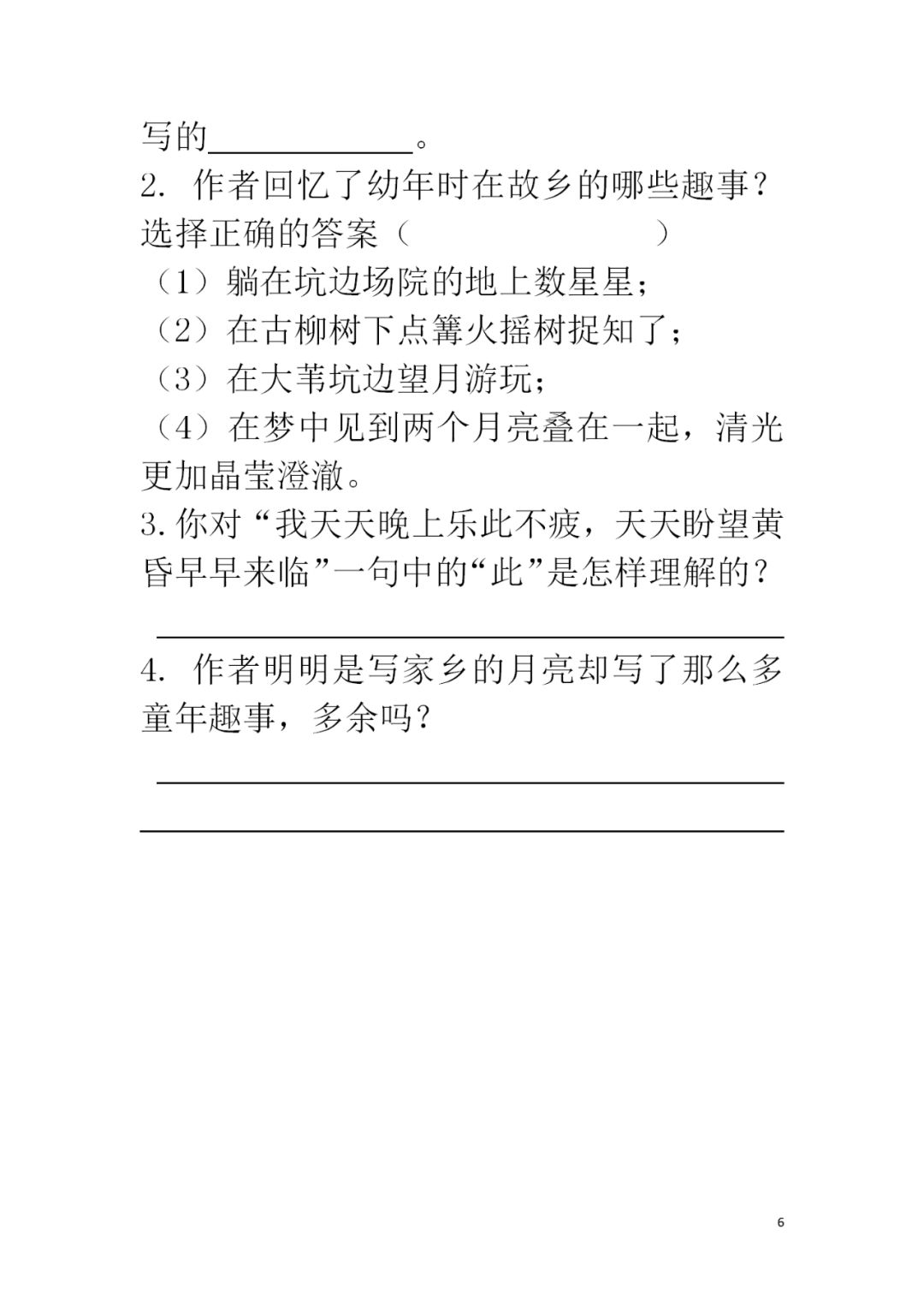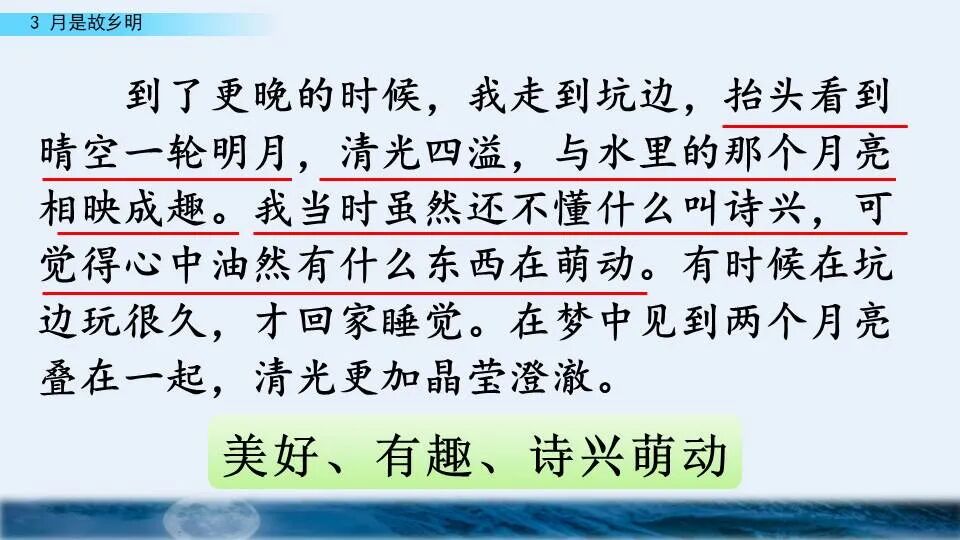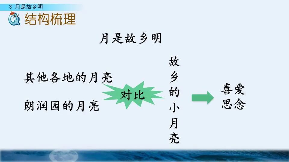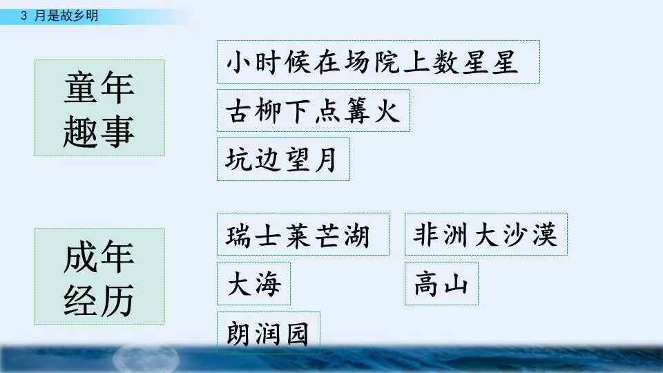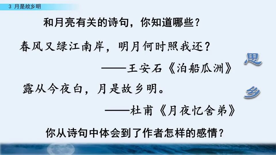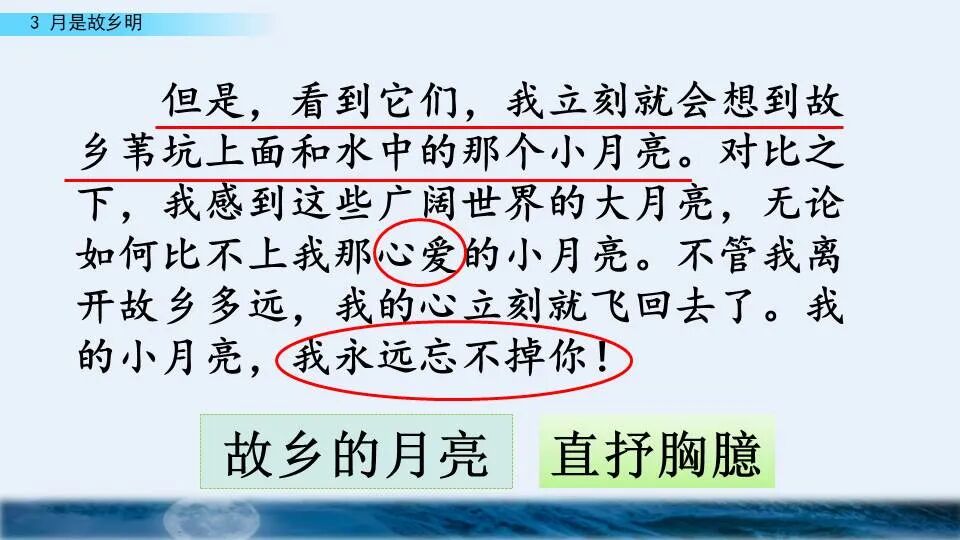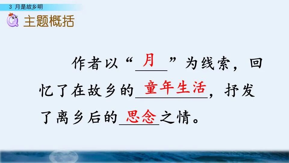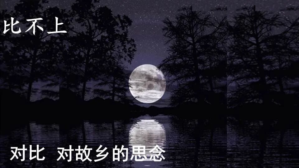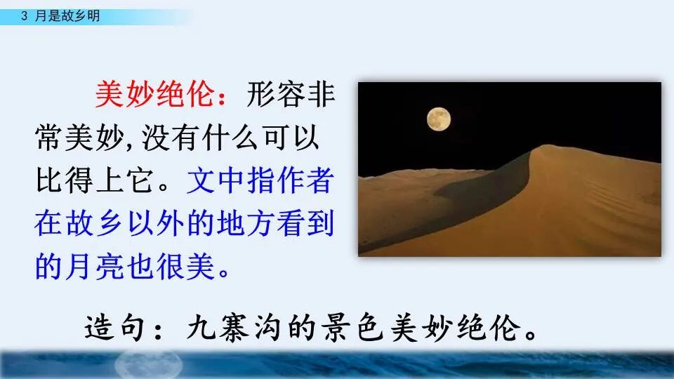 第二部分(2~6):写了月下故乡的山、水,以及离开故乡后在各地看到的月亮。答:①“月是故乡明”出自杜甫的《月夜忆舍弟》。 全诗为:“戍鼓断人行,边秋一雁声。露从今夜白,月是故乡明。有弟皆分散,无家问死生。寄书长不达,况乃未收兵。”②这首诗写于安史之乱时期,表现了作者对家人的思念。③月亮其实无处不明,但杜甫偏说“月是故乡明”,从而突出了对故乡的感怀。由于杜甫的这句诗特别能引发人的乡思共鸣,因而被广为传诵。答:写了两件件趣事:第一件事是躺在坑边场院的地上数星星;第二件事是在古柳下面点篝火,摇树捉知了。3、作者明明是写故乡的月亮,为什么还要写那些童年趣事呢?答:这些童年趣事都是围绕着月亮来写的,数星星、捉知了、赏月等都跟月亮有关,通过写这些铭刻在作者记忆中的童年趣事,表达出他对故乡的眷恋、思念之情。答:(1)通过对故乡的月亮及月下趣事的描述,表达了对故乡的思念之情。(2)拿世界各地见到的月亮与故乡的月亮作对比,表达对故乡的思念。本文以“月亮”为线索,深情回忆了童年记忆中的故乡月景和月下玩耍的趣事,以及离开故乡后在世界各地漂泊看到的无数美景和月亮,通过故乡之月与他乡之月的对比,表达了对故乡之月的喜爱,抒发了对故乡的思念与眷恋之情。★ 一弯新月高高挂在墨蓝色的天空,清澈如水的光辉普照着大地。