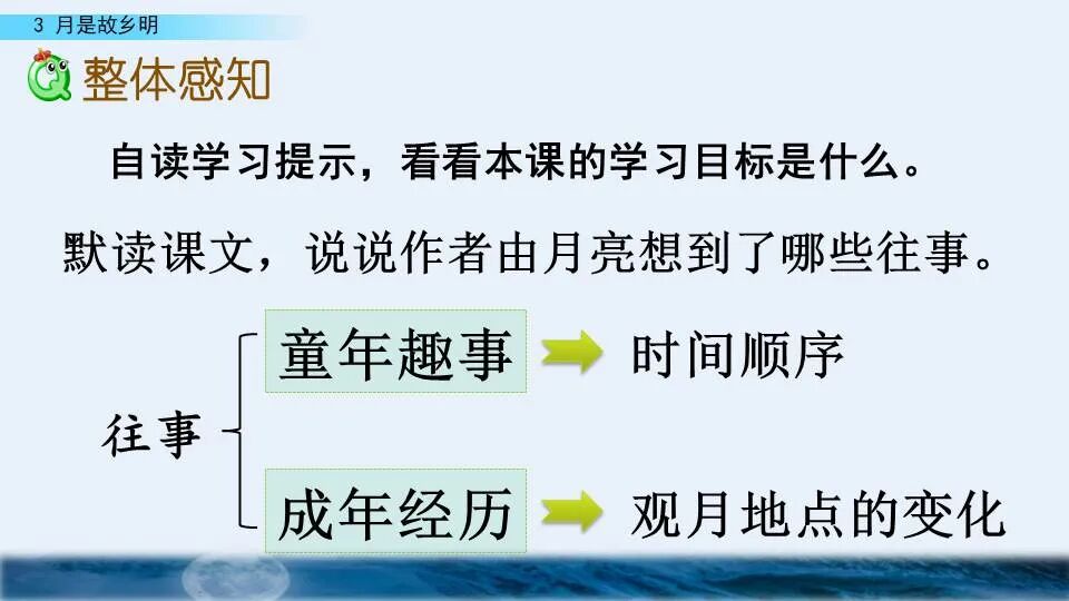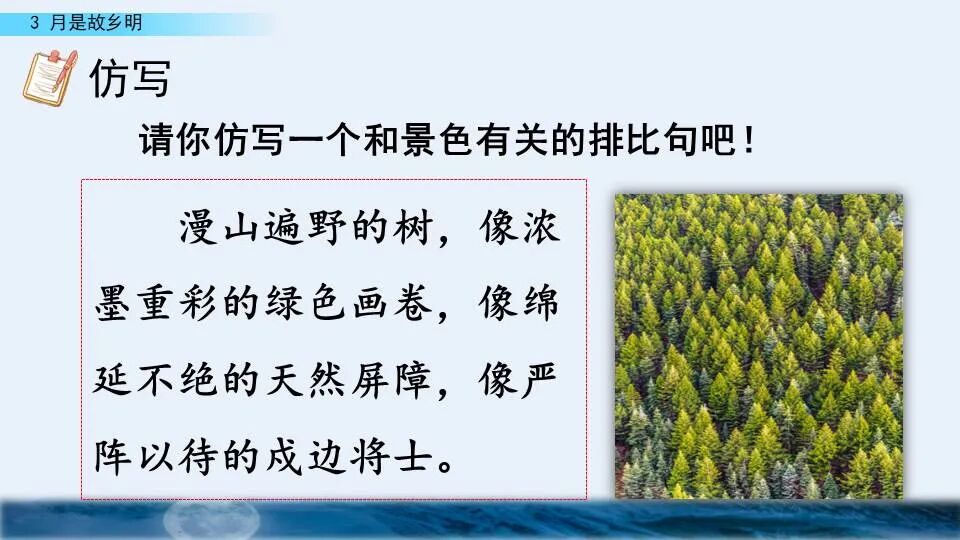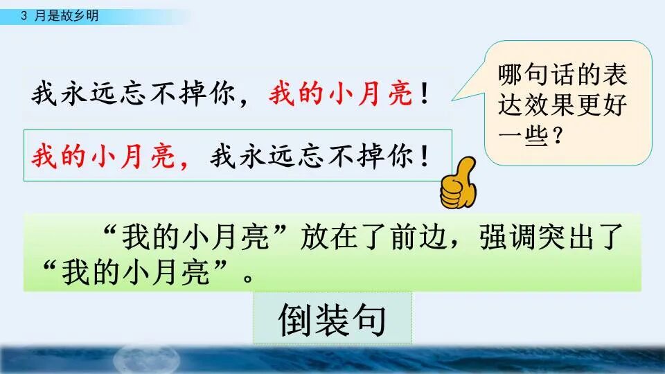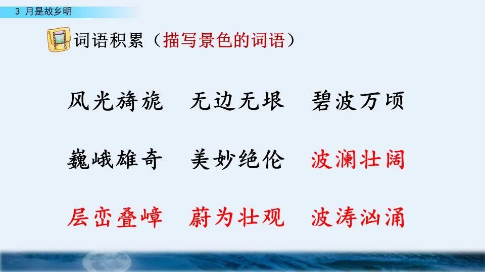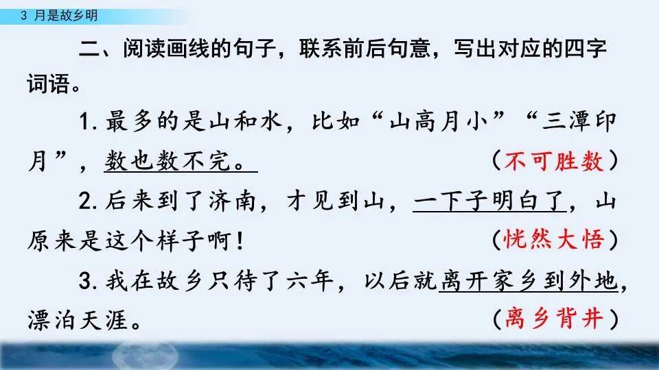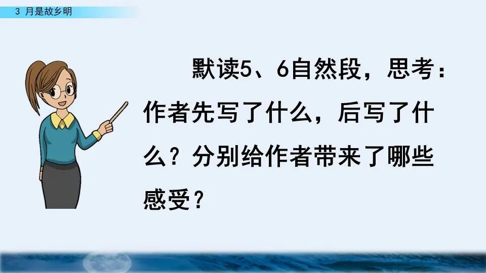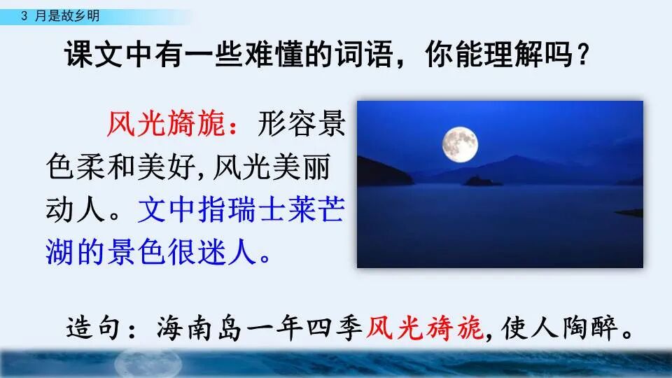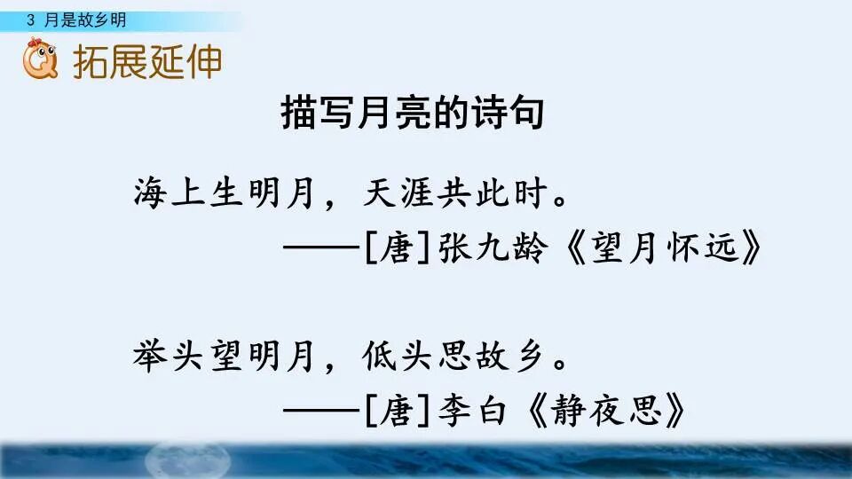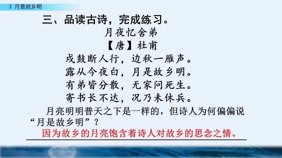 第二部分(2~6):写了月下故乡的山、水,以及离开故乡后在各地看到的月亮。答:①“月是故乡明”出自杜甫的《月夜忆舍弟》。 全诗为:“戍鼓断人行,边秋一雁声。露从今夜白,月是故乡明。有弟皆分散,无家问死生。寄书长不达,况乃未收兵。”②这首诗写于安史之乱时期,表现了作者对家人的思念。③月亮其实无处不明,但杜甫偏说“月是故乡明”,从而突出了对故乡的感怀。由于杜甫的这句诗特别能引发人的乡思共鸣,因而被广为传诵。答:写了两件件趣事:第一件事是躺在坑边场院的地上数星星;第二件事是在古柳下面点篝火,摇树捉知了。3、作者明明是写故乡的月亮,为什么还要写那些童年趣事呢?答:这些童年趣事都是围绕着月亮来写的,数星星、捉知了、赏月等都跟月亮有关,通过写这些铭刻在作者记忆中的童年趣事,表达出他对故乡的眷恋、思念之情。答:(1)通过对故乡的月亮及月下趣事的描述,表达了对故乡的思念之情。(2)拿世界各地见到的月亮与故乡的月亮作对比,表达对故乡的思念。本文以“月亮”为线索,深情回忆了童年记忆中的故乡月景和月下玩耍的趣事,以及离开故乡后在世界各地漂泊看到的无数美景和月亮,通过故乡之月与他乡之月的对比,表达了对故乡之月的喜爱,抒发了对故乡的思念与眷恋之情。★ 一弯新月高高挂在墨蓝色的天空,清澈如水的光辉普照着大地。