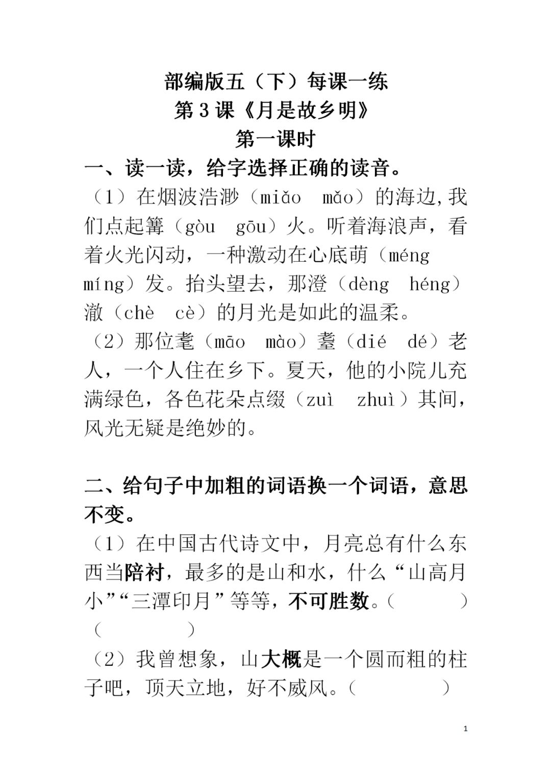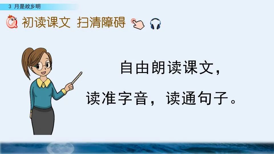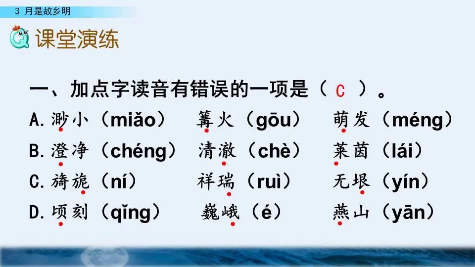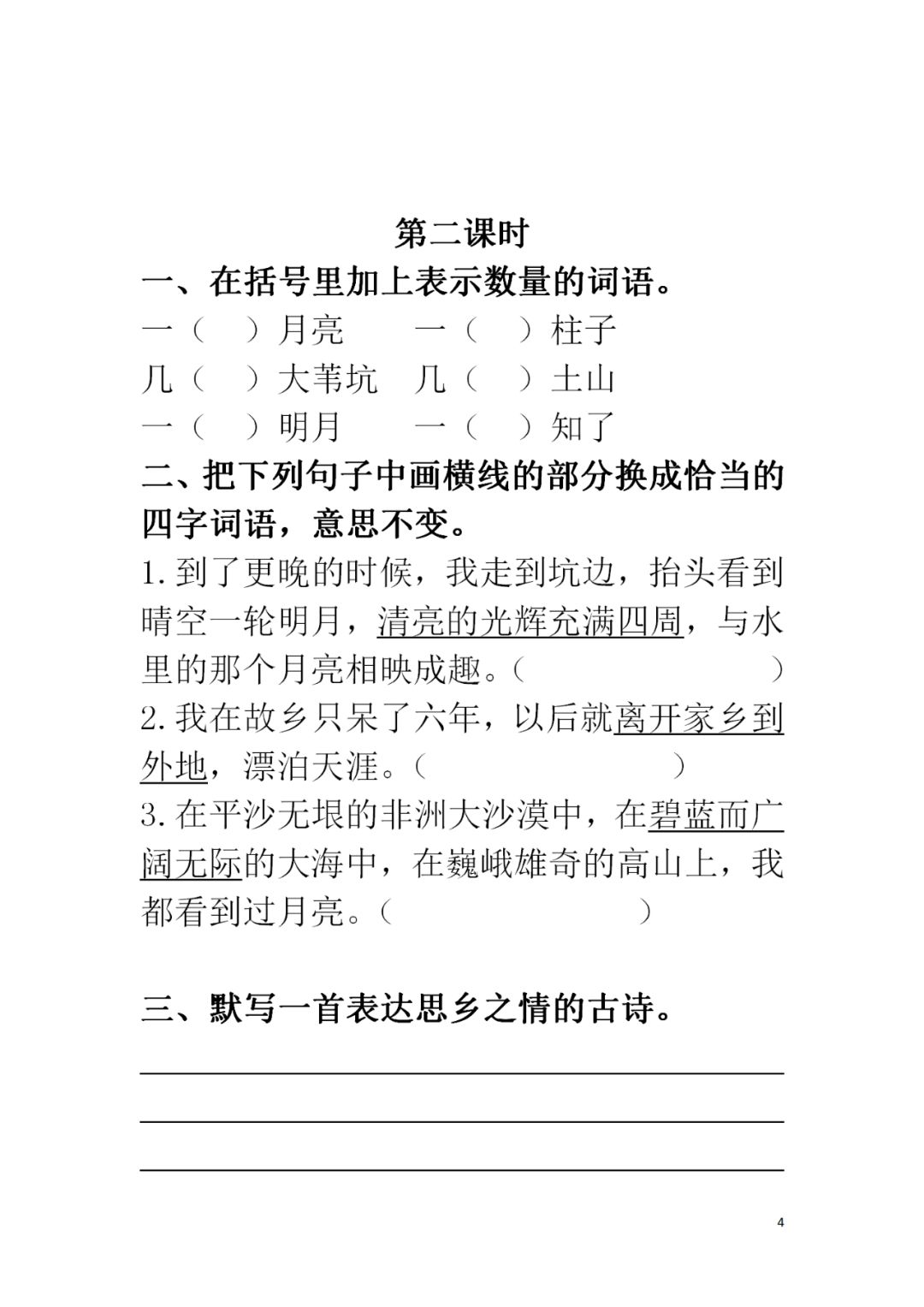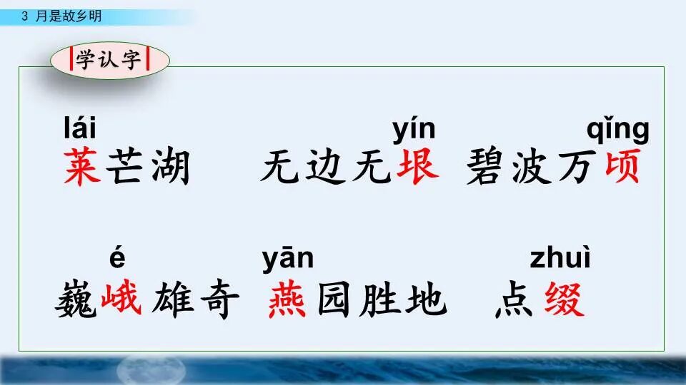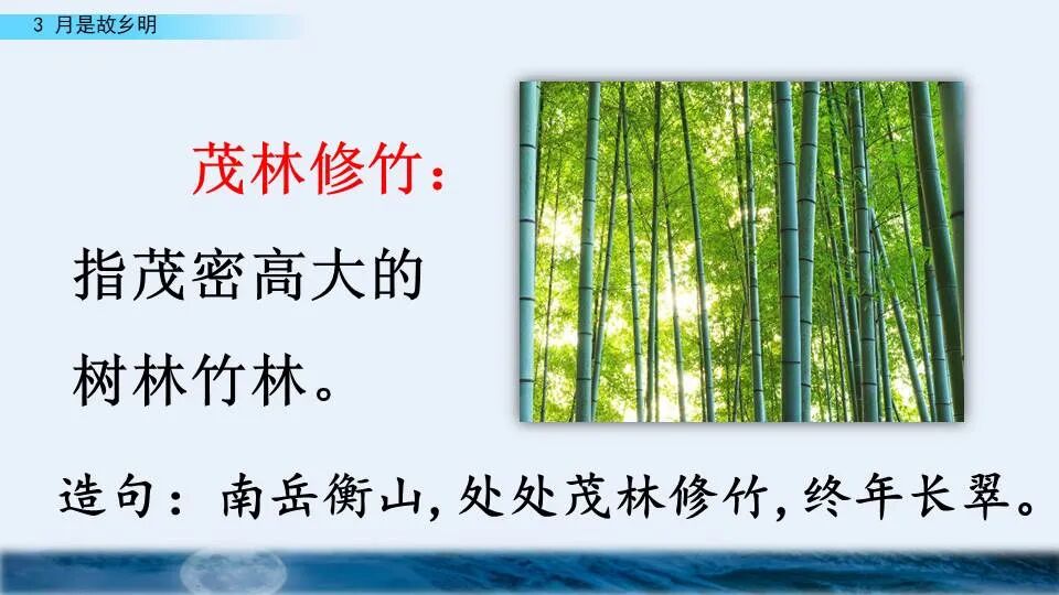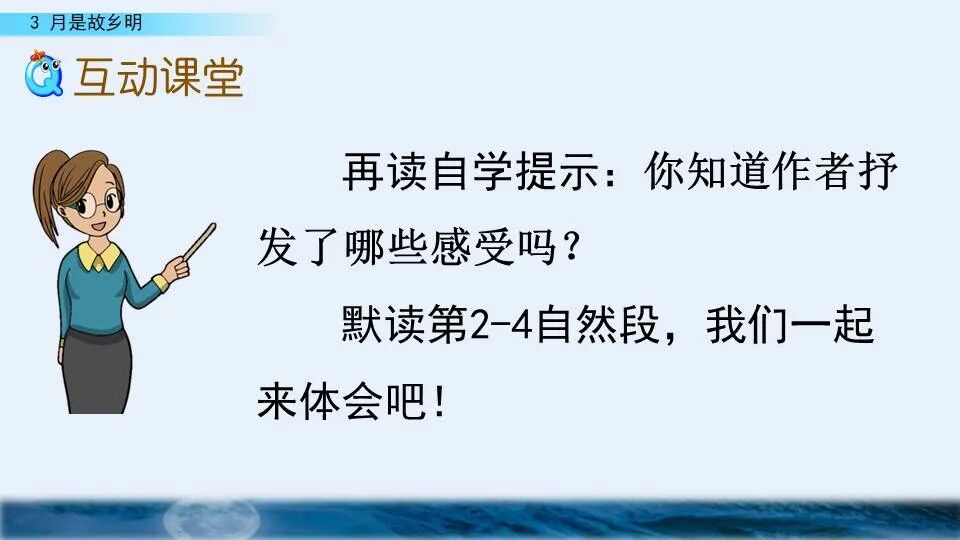 第二部分(2~6):写了月下故乡的山、水,以及离开故乡后在各地看到的月亮。答:①“月是故乡明”出自杜甫的《月夜忆舍弟》。 全诗为:“戍鼓断人行,边秋一雁声。露从今夜白,月是故乡明。有弟皆分散,无家问死生。寄书长不达,况乃未收兵。”②这首诗写于安史之乱时期,表现了作者对家人的思念。③月亮其实无处不明,但杜甫偏说“月是故乡明”,从而突出了对故乡的感怀。由于杜甫的这句诗特别能引发人的乡思共鸣,因而被广为传诵。答:写了两件件趣事:第一件事是躺在坑边场院的地上数星星;第二件事是在古柳下面点篝火,摇树捉知了。3、作者明明是写故乡的月亮,为什么还要写那些童年趣事呢?答:这些童年趣事都是围绕着月亮来写的,数星星、捉知了、赏月等都跟月亮有关,通过写这些铭刻在作者记忆中的童年趣事,表达出他对故乡的眷恋、思念之情。答:(1)通过对故乡的月亮及月下趣事的描述,表达了对故乡的思念之情。(2)拿世界各地见到的月亮与故乡的月亮作对比,表达对故乡的思念。本文以“月亮”为线索,深情回忆了童年记忆中的故乡月景和月下玩耍的趣事,以及离开故乡后在世界各地漂泊看到的无数美景和月亮,通过故乡之月与他乡之月的对比,表达了对故乡之月的喜爱,抒发了对故乡的思念与眷恋之情。★ 一弯新月高高挂在墨蓝色的天空,清澈如水的光辉普照着大地。