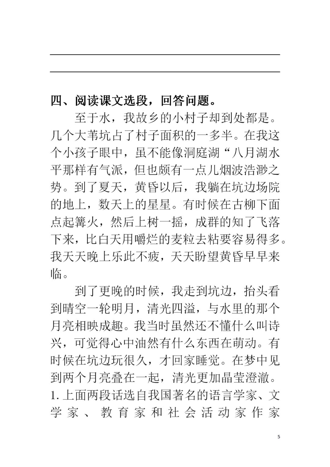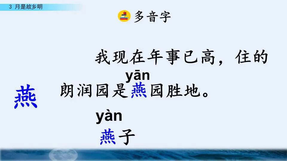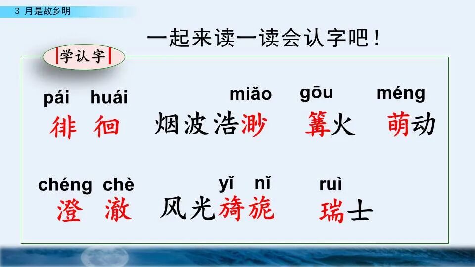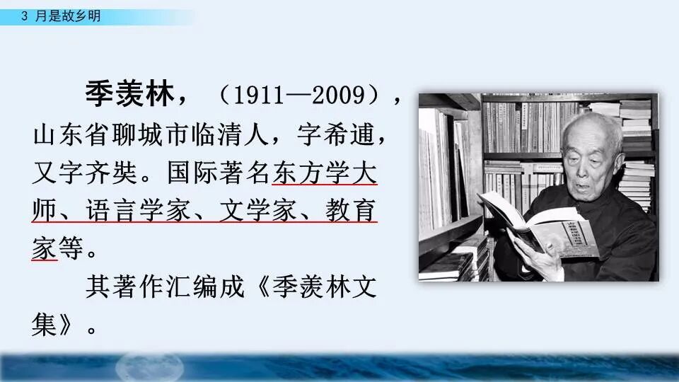 季羡林 (1911.8-2009.7),字希逋,又字齐奘,北京大学教授、中科院院士、国际著名东方学大师、语言学家、文学家、国学家、佛学家、史学家、教育家和社会活动家。语言学家、文学翻译家,精通12国语言,翻译了大量作品。生于1911年,山东临清县人。1930年考入北京清华大学西语系。1935年赴德国留学。1941年获哲学博士学位。1946年回国,历任北京大学教授兼东方语言文学系教授、系主任。季羡林、金克木、邓广铭、张中行四位老先生,因为都曾在燕园居住,人称“未名四老”。四位先生实则住在未名湖的后湖,那地方叫朗润园。所以又称 “朗润园四老”。【陪衬】①附加其他事物使主要事物更突出;衬托。②陪衬的事物。本文是第二种意思。【烟波浩渺】形容江湖水面十分辽阔。烟波:烟雾笼罩的江湖。浩渺;辽阔无边。【篝火】原指用笼子罩着的火,现借指在空旷处或野外架木柴树枝燃烧的火堆。【乐此不疲】因喜欢做某件事而不知疲倦。形容对某事特别爱好而沉浸其中。【相映成趣】互相对照映衬,显得很有情趣,很有意思。映:映衬。趣:意趣。【离乡背井】离开了故乡,在外地生活(多指不得已的)。【良辰美景】美好的时光,优美的景色。良辰:美好的时光。1、每个人都有个故乡,每个人的故乡都有个月亮。人人都爱自己故乡的月亮。2、 以后到了济南,才见到山,恍然大悟:山原来是这个样子啊!因此,我在故乡望月,从来不同山联系。像苏东坡说的“月出于东山之上,徘徊于斗牛之间”,完全是我无法想象的。作者的家乡在山东西北部大平原上。小时候从来没有见过山,不知道山为何物,所以无法理解诗句描写的景象。3、 我当时虽然还不懂什么叫诗兴,可觉得心中油然有什么东西在萌动。作者看到天空中的明月,清光四溢,看到水中的月亮与之相映成趣,心中萌动的一定是对明月的赞美,是对家乡的歌颂。4、不管我离开我的故乡多远,我的心立刻就飞回去了。我的小月亮,我永远忘不掉你!这段话通过世界各地的月亮与故乡的小月亮作对比,表达自己对故乡的思念之情。第一部分(1):将故乡和月亮联系在一起,引出“月是故乡明”的主题。