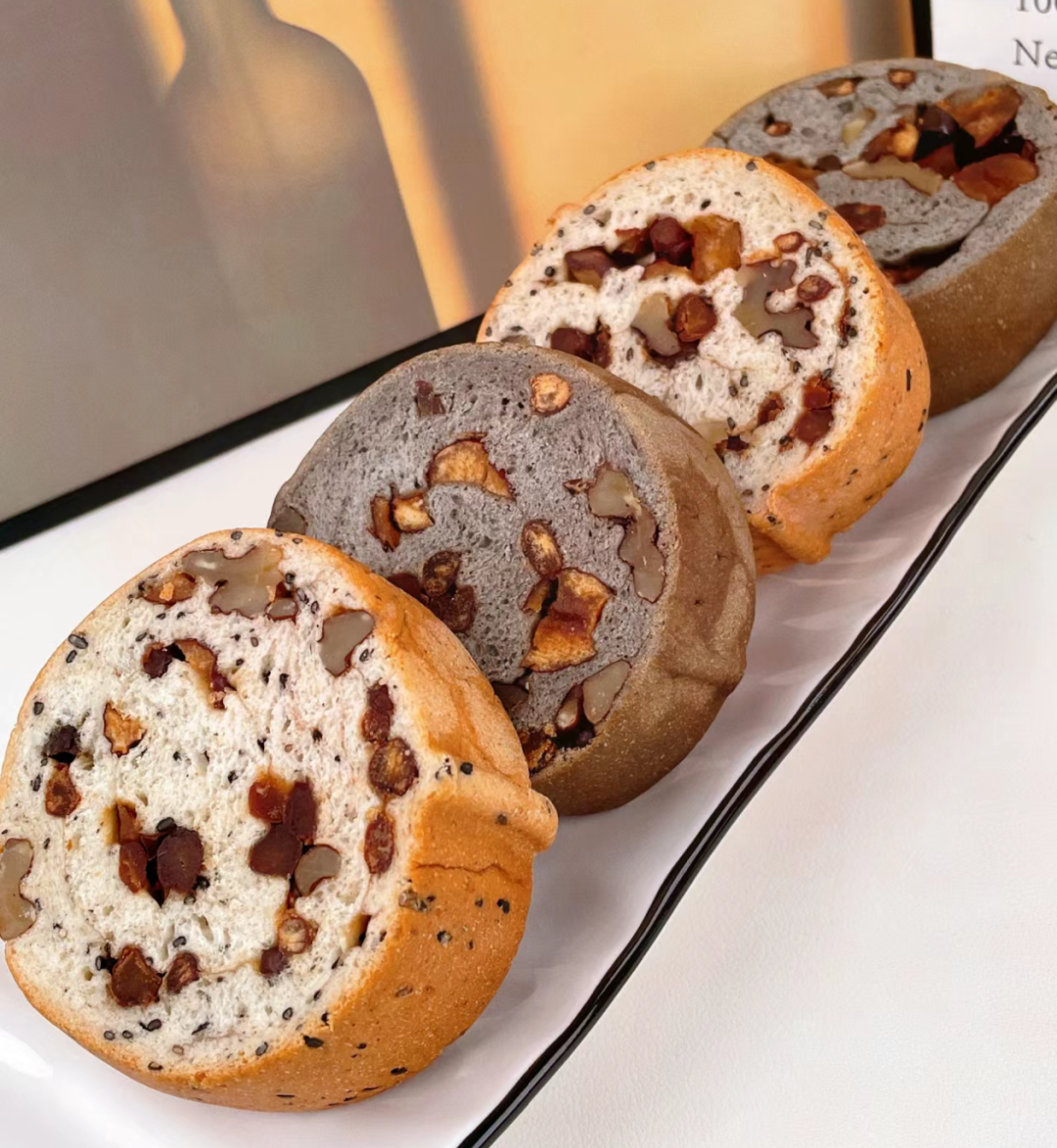 这款五黑果仁车轮面包可是原料十足的“黑”,原料有黑芝麻、黑米、黑豆、黑藜麦、黑桑葚。
