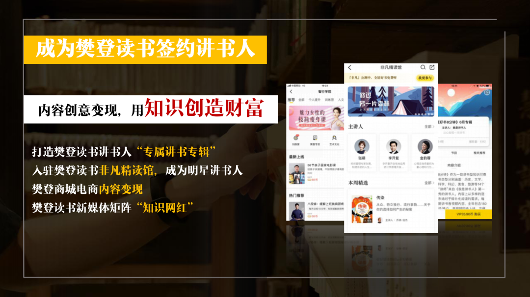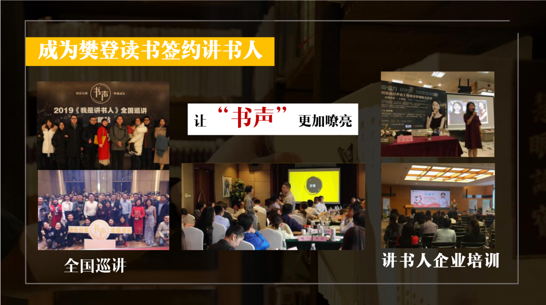 小海按:读书,可以让一个人走出迷茫,而讲书,可以让一群人获得能量。从一个焦虑的职场人,到一个从容的创业者,改变樊登老师命运的不只是读书,还有讲书。现在樊登读书主办的《有请讲书人》讲书大赛通过选拔、培养职业讲书人帮助更多人实现梦想,用知识创造财富,一起跟小海来看下吧。 柳舒淇 这几天“摆摊”成了个热门词汇,说要去摆摊是开玩笑,但危机感、迷茫和焦虑都是真的。樊登老师也经历过迷茫期,他曾吐槽自己是一个不知名的央视主持人,面对工作困境,他拿起了书。他不仅自己尝到了读书的甜头,还通过讲书,把一本本厚厚的书,解读成40分钟左右的解读精华。让没有时间和能力读到书籍精髓的人,也能走进书香世界,体会读书的乐趣,获得真正的改变。在《奇葩大会》上,樊登老师说:“如果你觉得生活中有任何困难,都一定有一本书等着你,所以希望大家也能够加入到阅读的行列中来。” 读书,可以让一个人走出迷茫,而讲书,可以让一群人获得能量。从一个焦虑的职场人,到一个从容的创业者,改变樊登老师命运的不只是读书,还有讲书。 讲书也可以成为一个职业吗? 我们平时看完一本书或是一部电影,也会给身边人讲一讲,这样看似寻常的事情也可以成为一个职业吗?现代生活节奏加快,每个人都有提升自我的需求,但并没有那么多时间去选书、读书。读书产品的出现,是社会发展的必然趋势。就樊登读书平台来说,每天都需要非常多的读书产品。一本好书,可以做成精华解读音视频、书单、书评、课程、社群等十几种产品。讲书人最大价值莫过于让更多人get到书里的知识,以此改变生活。正如樊登老师所说: “我每年给大家讲50-60本书,很多书友都觉得人生有了改变,这不是我在帮你,而是书在帮你。每本书都有一个使命,讲书人的任务,就是帮它完成使命!” 成为讲书人好处 成为讲书人至少有2大好处。 第二,提高硬实力,拓宽收入来源。因为讲书,是人工智能很难取代的职业。现在,人工智能越来越发达,很多职业都会慢慢被人工智能淘汰。只有凝练了人类智力的职业,才很难被人工智能取代。 讲书人就是这样一个智力型职业。一个讲书人,兼职写一篇拆书稿就可能获得1000-8000元的稿酬。对很多人来说,已经是一个月的工资了,何乐而不为呢? 那么,普通人怎样快速成为职业讲书人呢? 讲书人文婧的参赛照片和她的抖音 冠军柳舒淇和亚军王冠傑都是90后,参加比赛时,他俩都是刚参加工作。他们通过大赛分别获得了100万和30万的讲书合约,成为了职业讲书人,收入和同龄人拉开了好几档差距。王冠傑赛后就在成都交了首付,买了一套房,因为他相信:“讲书这个事业,就像投资房产一样,稳赚不赔。” 而且大赛结束后不久,他俩就各自找到了人生伴侣,走入了婚姻殿堂。果然会讲书的人都有一个有趣的灵魂,总能吸引到优质伴侣。 还有许多参赛选手都通过《我是讲书人》大赛,找到了自己的终身事业——讲书。8强选手李赛男,比赛结束后她创建了自己的读书会,发展成熟后一个月营收50万,她也经常来参加樊登读书的线下讲书活动。她在微博里写道:“最开始,我理解的成长是通过自己的努力实现财富自由,后来我通过讲书做到了。现在我理解的成长是成就身边人,当我通过讲书影响越来越多的人开始行动、开始改变、开始成长时,那是我最大的快乐。” 还有一位参赛者王丹,她原本是一位抑郁症患者。艰难的北漂生活让她一度否定自己,直到鼓起勇气参加了《我是讲书人》大赛。她在书中得到了治愈,又把这份收获通过讲书分享给观众,观众为她鼓掌、评委给她点赞,这极大地鼓舞了她。 他们通过讲书改变了人生轨迹,不仅实现了财富上的跃迁,更重要的是他们爱上了读书,还把讲书作为了自己终身都不会抛弃的事业,这一点,将使他们的整个人生都充盈而富足。因为,他们是讲书人!他们可以,你也可以! 看《我是讲书人》升级版大赛 樊登读书《我是讲书人》重磅升级 《有请讲书人》 2020短视频大赛 赛制升级,挑战升级! 樊登读书《我是讲书人》原创赛事团队, 头部短视频平台千万流量加持, 下一个明星讲书人,就是你! 一、大赛时间 第一赛段6月15日—7月4日50强入围赛 第二赛段7月7日—7月27日20强入围赛 第三赛段8月10日总决赛 二、大赛参与方式与晋级奖励 《有请讲书人》讲书大赛分为个人赛道和机构赛道: 1、个人赛道:参赛选手将参赛讲书视频上传到快手APP的选手自有账号,发布时加上话题#有请讲书人#@樊登·有请讲书人@樊登读书,即可参与个人赛道讲书比拼。 2、机构赛道:参赛选手将自行录制的参赛讲书视频,发送到“有请讲书人”大赛官方邮箱:jiangshuren@dushu.io。樊登读书作为《有请讲书人》大赛的总发起方、制作方,统一将合格的参赛视频上传至快手APP@樊登·有请讲书人,进行机构赛道排名比拼。 (只要你参赛,就有机会获得官方账号千万流量扶持,上图为部分官方账号截图) 只要进入50强,就有机会成为樊登读书签约讲书人,得到专业的培训和商业变现规划。你将有机会参加全国巡讲、大型官方品牌活动、企业培训,还将得到入驻樊登读书官方平台,APP、新媒体等全站流量扶持,成为明星讲书人! 而这一切的开始,只需要你鼓起一点点勇气,来参加《有请讲书人》大赛! 详细参赛指南及立即报名,点击下方阅读原文。 来源:樊登读书 ▼ 最新政策详解