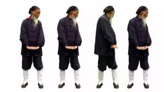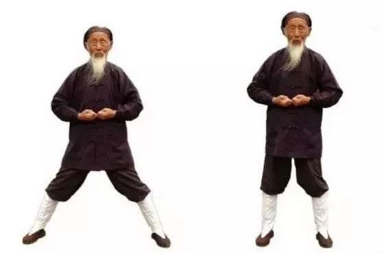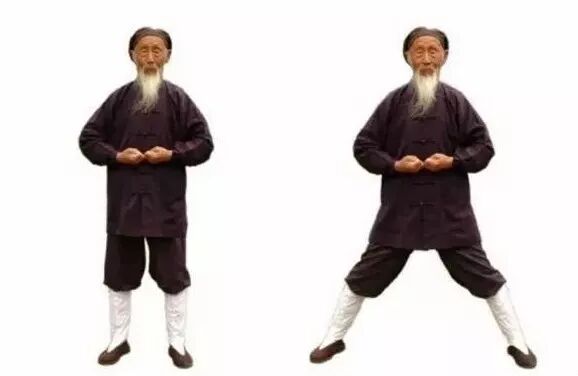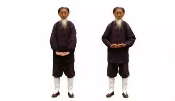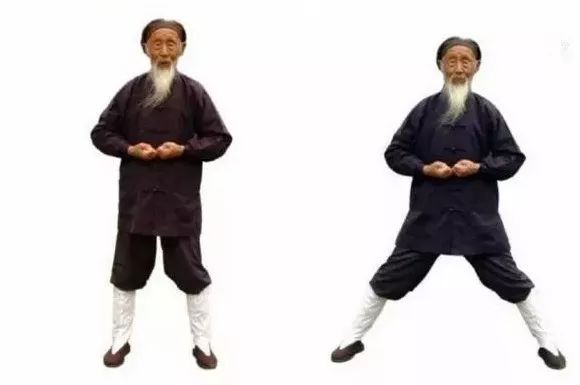 预2 左脚向左拉开,与肩同宽。两手五指并拢,稍用力(内劲),伸直。两臂伸直,两手向体侧略转,掌心向后稍斜。气机开始发动。预4 两手继续向前移至腹部,一手在脐上,一手在脐下,两手劳宫穴(握拳时,中指尖指向处)处在一条直线,上下相对。气归中宫(心与肾中间处)。