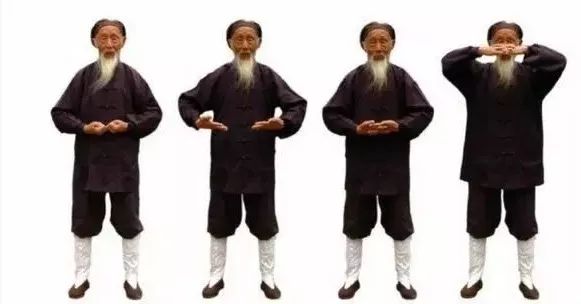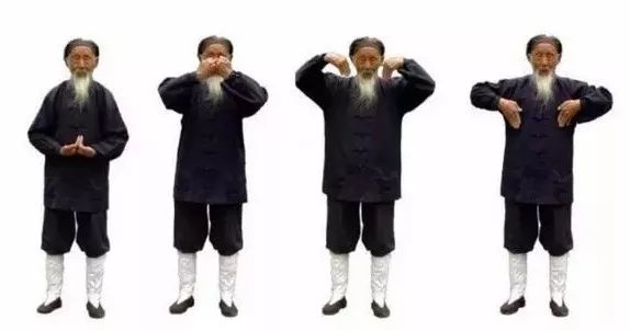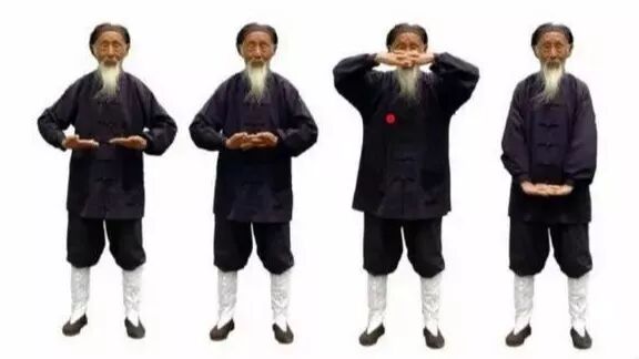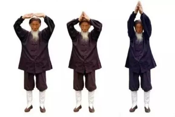 1.2 直臂向身体两侧渐举至肩平,掌心向下,稍停。默念“生”字,以助气上升。1.3 两手五指并拢,以腕为轴,用内劲向上翘成立掌,掌心向外。1.4 曲肘,两手仰掌,向头顶百会穴(前后头发中点联线与两耳尖联线的交会点)处相靠,中指尖相接,置于百会穴上方约两指宽外,稍停。默念“长”字,再助气长。1.6 两臂用力,猛向天空插至直立,稍停。默念“化”字。1.7 双手分开,两臂分别向体侧渐降至与肩平,掌心向下,稍停。默念“收”字。1.9 两臂向下搂抱至腹部,两手分开,分别贴于脐部,稍停。默念“藏”字。
