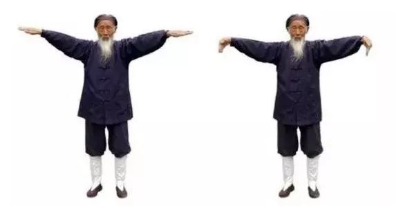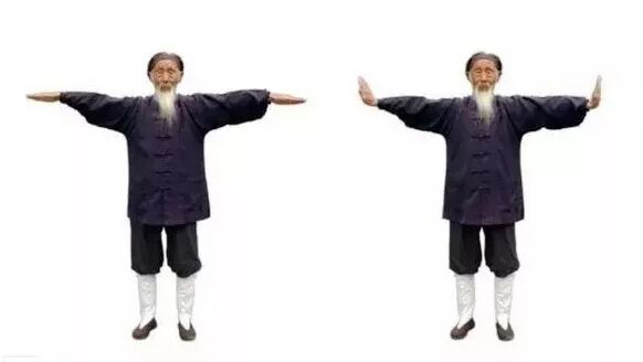 6.2 夹臂定神:双拳变掌,掌心向上,五指伸开,中指相对,左右手同时向左右横向拉开,在身躯边为止,稍停。