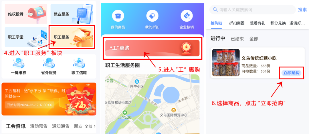 2.在“维权宝”应用首页,点击“职工服务”,进入“职工服务”板块,点击“工”惠购,参与抽奖。