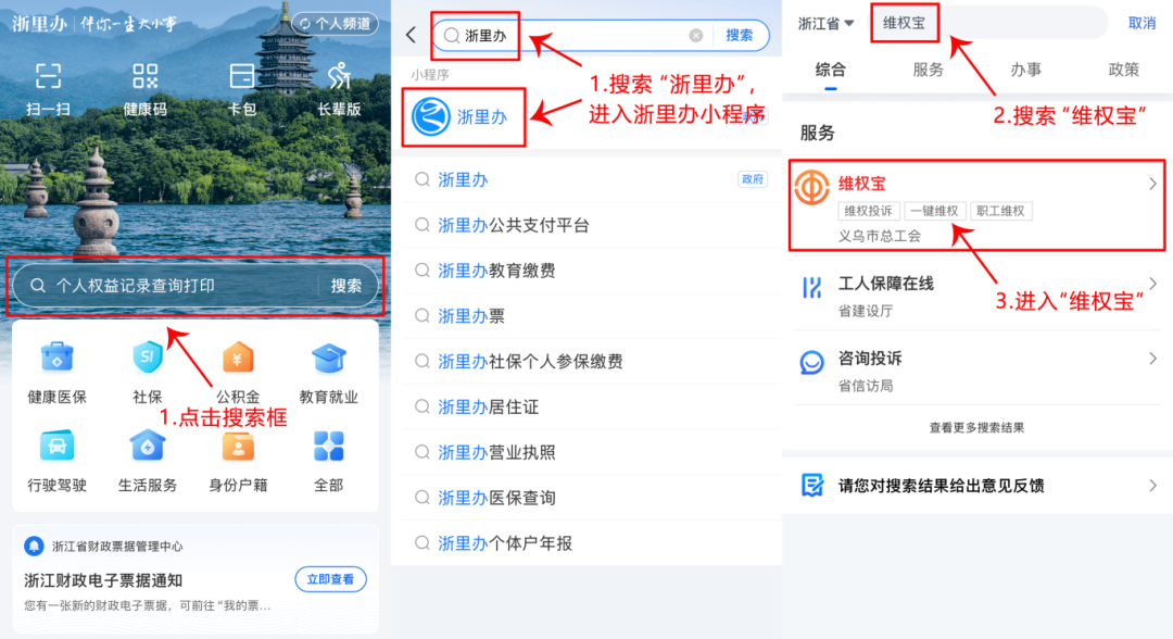 1.打开“浙里办”APP,或微信、支付宝中搜索“浙里办”,三者均可在首页搜索“维权宝”,点击进入“维权宝”应用。