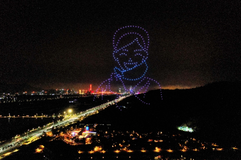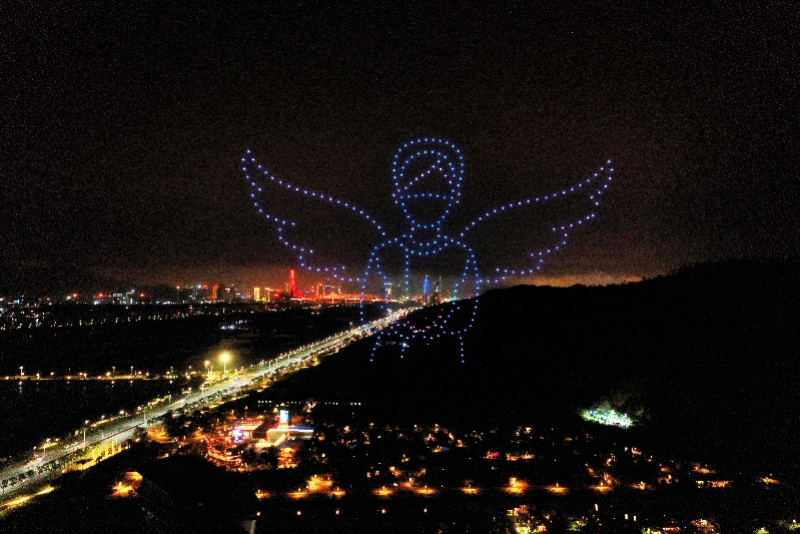 炫酷的声光、暖心的情节,让表演精彩纷呈。最后,无人机组成了“爱在星乐度”字样,文字周围爱心和五角星旋转,字体流光溢彩。