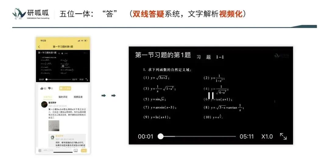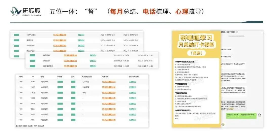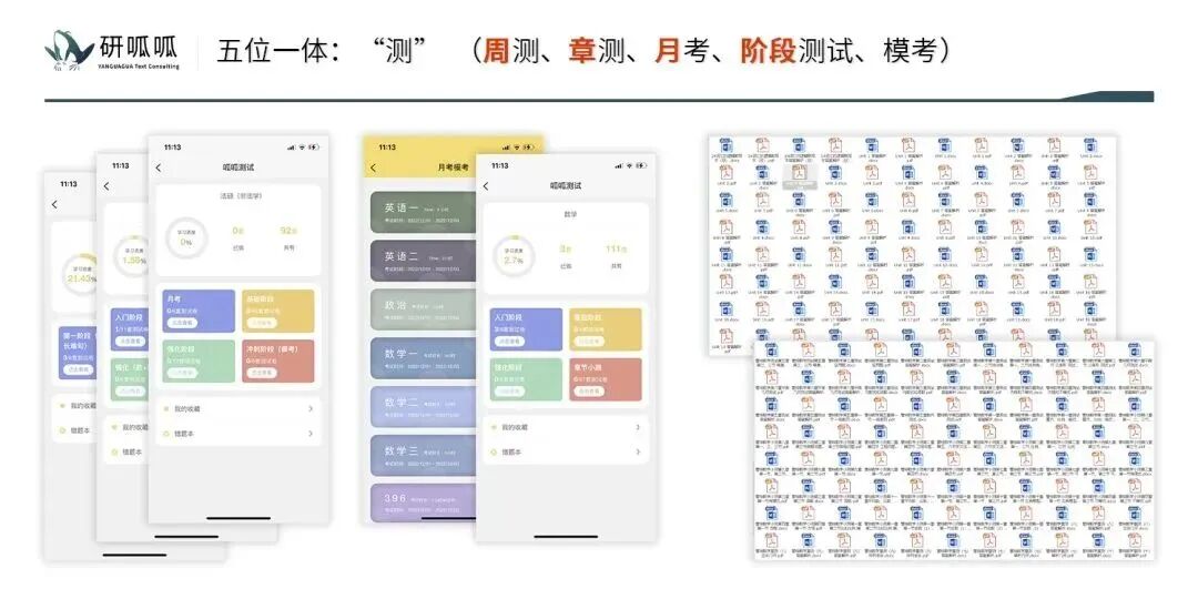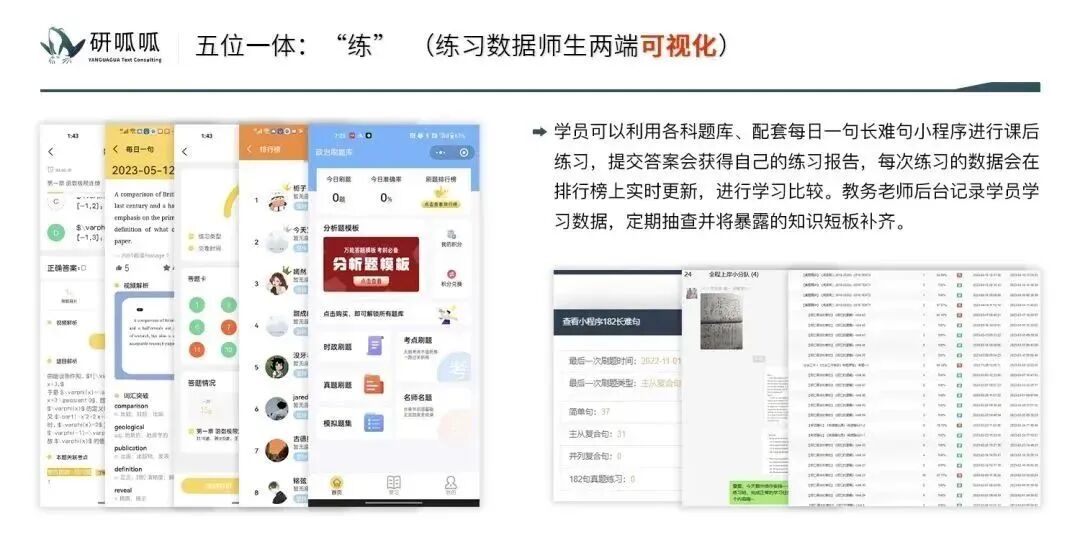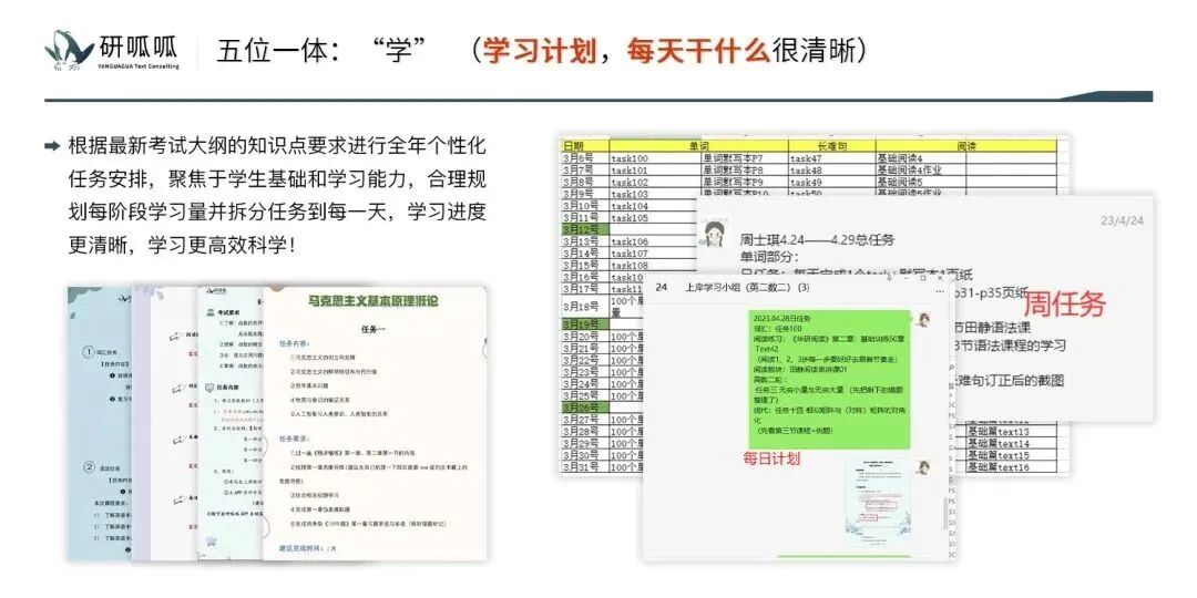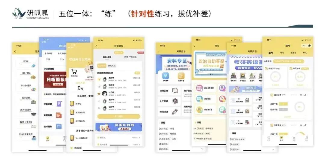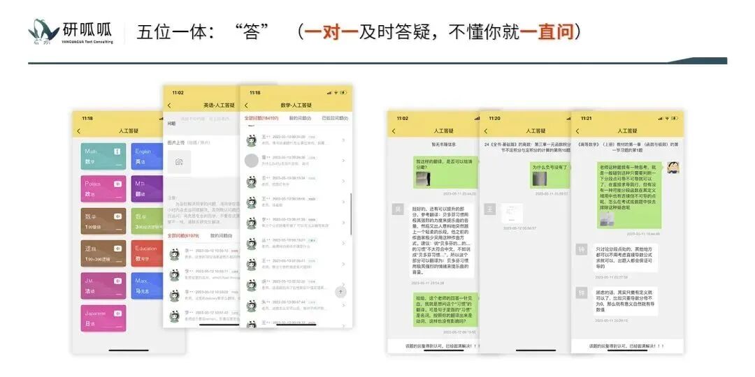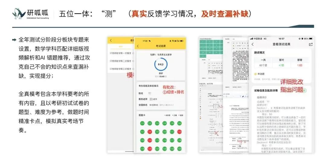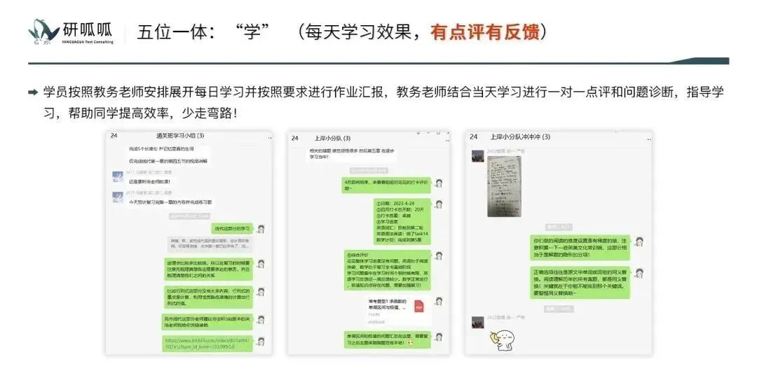 公共课的学习是按照“学练测答督”五步法来帮你高效提分(具体见下文)。专业课的学习是由研呱呱合作的直系高分研究生一对一辅导。咱们分别来说>>>提示:复习用书如果学员想用研呱呱之外的书籍,可同等替换(报销)。学习是全程跟着APP上的名师课程分阶段进行的,因为每个名师讲课的优势版块不一样,所以不同学习版块,会配备针对性最强的名师课程。教务老师会根据摸底情况,给你做每天的学习计划,详细规划好你每天需要听什么课、看什么书、做什么作业,需要完成到什么程度。每一天你需要做什么,都是非常清晰的。这个学习计划,会根据你之后的学习情况随时作调整。你只需要学习就好,在规定的时间内完成任务,没完成就会进行督学,遇到任何问题及时给你的教务老师反馈。第二步就是练,用来巩固学到的知识点。你学完之后就有针对性的练习安排给你,比如每天的单词、语法长难句练习、数学的章节练习、APP题库练习等等。只听老师上课讲,你都会感觉会了,实际要靠做练习来巩固复习,到底听懂没、吸收的内容有多少,学会举一反三,对反馈出来自己掌握薄弱的,还不能掌握的,及时反馈给教务老师,针对性帮助你。学了,也做了练习,接下来就得通过测试来检测学习效果。你在这个阶段会经历大大小小很多次测试,比如周测、章测、月考、阶段测试卷、或者是自测卷。测试之后的分数和排名,会和研呱呱同届学员做一个对比,这样也更有氛围。测的部分,保证你可以及时查缺补漏,对自己学习情况有个清晰的认知,对下一个阶段学习安排也有侧重。经过第一步的学习、第二步的练习、第三步的测试,你一定会遇到一些很个性的问题,这个时候就需要个性化的答疑才能解决。为此,研呱呱研发了——双线答疑系统(自助答疑+人工答疑)自助答疑系统:包含市面上主流的教材和教辅书籍,这些书籍的课后练习都配有详细的习题讲解,确保你在书上看到答案是“略”或者“跳步骤”看不懂的时候,可以在自助答疑系统上,得到详细的讲解。人工答疑系统:如果你的问题非常个性,可以用人工答疑系统,直接把问题拍照上传,后台有几十位老师抢单式答疑,次数不限,你在听课做题过程中,有任何不会的,直接问答疑老师们就行。督学是贯穿始终的,教务老师每天会在你的学习专属群里,一对一提醒你去学习,如果你没学习,并且不回应的话。我们的学管老师会跟你甚至你的家长电话沟通,了解你的情况,给你加油和进行心理疏导。“学-练-测-答-督”五步,共同构建了完整的学习闭环,持续推动才能取得真实的进步,而非靠感觉来评估自己的学习效果。你考哪个学校什么专业,研呱呱会专门为你配备一个这个学校专业的高分上岸研究生,因为他们熟知专业课考试的难点和重点,能够让你高效复习拿高分!