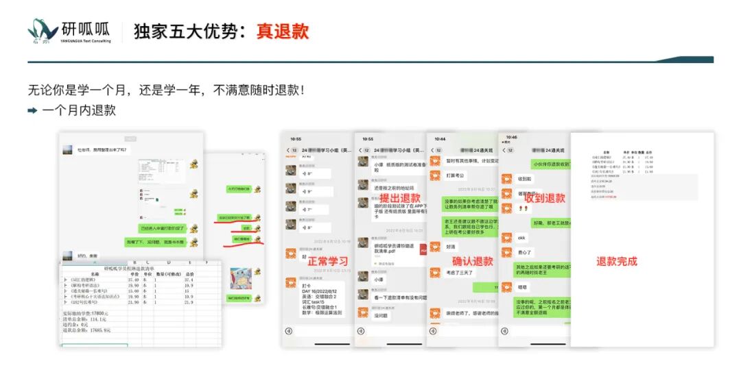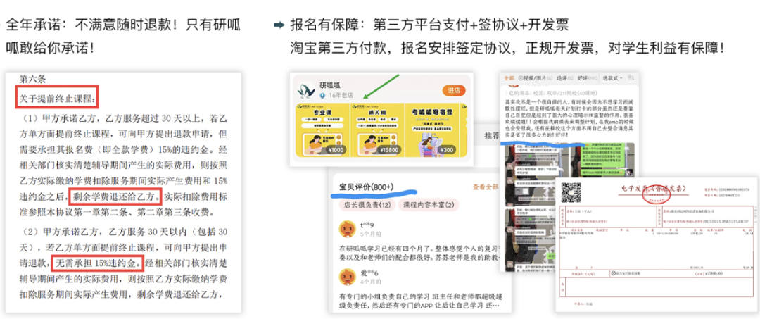 研呱呱的辅导可以说涵盖了所有的考研环节,为了保证辅导的质量,坚实的保障必不可少。报名研呱呱有3大保障:第三方平台支付(淘宝)+签协议(一式两份)+开正规发票一个月之内无理由退款,无违约金。承诺全年,不满意可以随时退