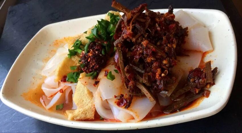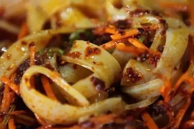 一份浓香四溢的大武口凉皮,不仅极大地满足着人们的味蕾,还寄托着浓浓的乡愁。做凉皮面粉和调料是基础,决定着凉皮的口感和香味,而加工过程决定着凉皮的外观品相,洗面、蒸面筋、蒸凉皮、炸辣椒、配调料...每一步都极其讲究,每个环节都做好了,凉皮的色香味就都有了。卷凉皮也是很多人的挚爱,就是把黄瓜、熟花生、面筋、香菜等用芝麻酱和其他调料拌匀后放入一大张凉皮里面,然后裹成卷即可食用,方便携带又好吃。盐池肝子凉皮也是别有风味,不爱的人不屑一顾,爱的人却可以百吃不厌。顾名思义,这其中的点睛之笔就是那一勺羊肝了,在盐池生活过的人,大多对羊肝凉皮情有独钟。羊肝凉皮薄得透亮,口感筋道,配上精心制作的豌豆大小的过油香酥麻辣羊肝,羊肝汁渗入了凉皮,但不腥也不腻,味道独树一帜。色泽诱人,口感柔韧润滑 ,再浇上红红的辣子油,配上、香菜、芹菜等佐料, 吃起来清凉香醇,吃了第一口想吃第二口。
