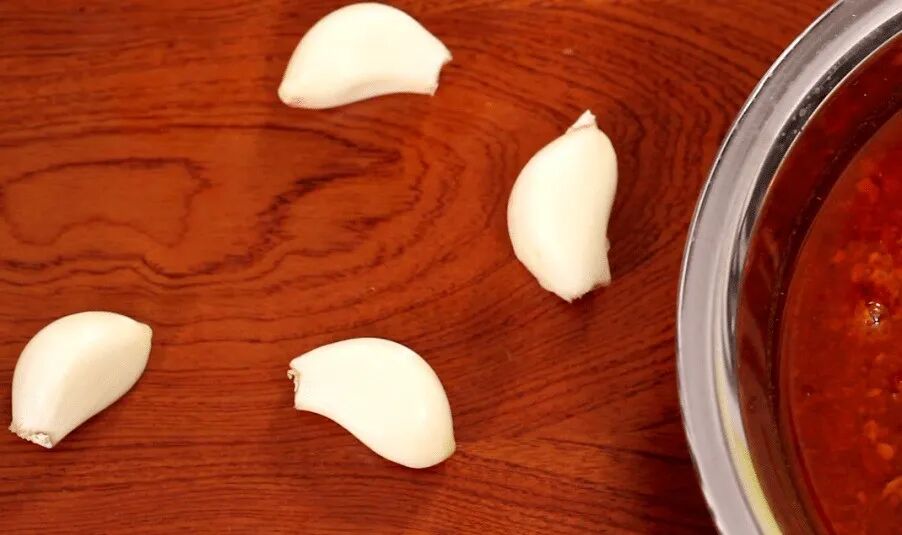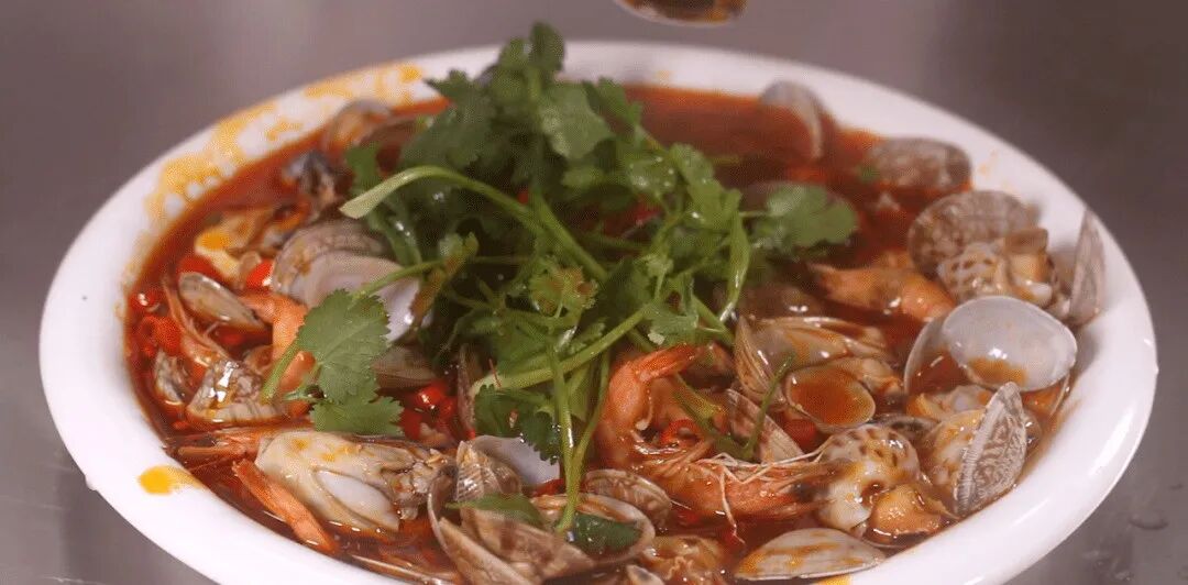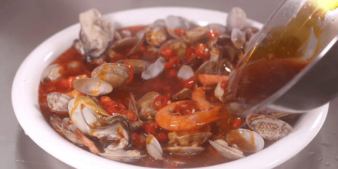 2、依次放入花甲 15-18 个,山胡椒油适量,蒜沫 5 克、红油 4 克、鸡精 3 克、味精 5 克、豆豉 3 克、秘制酱 6 克、高汤腌住、剁椒 3 克、