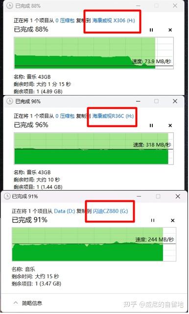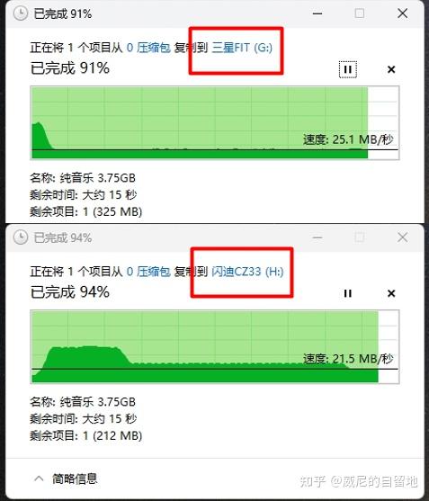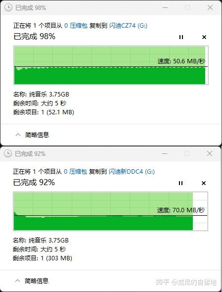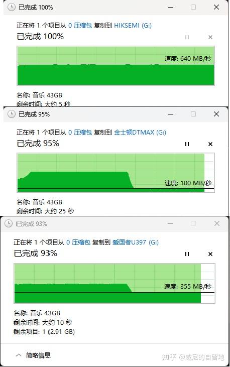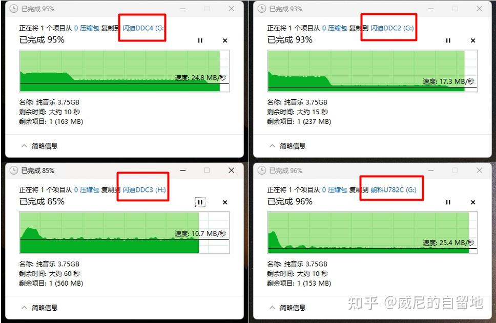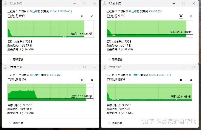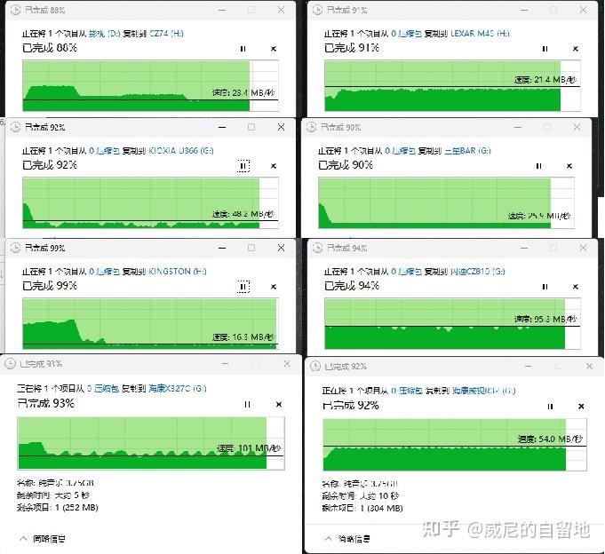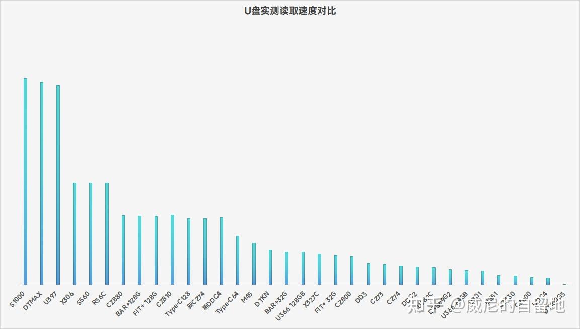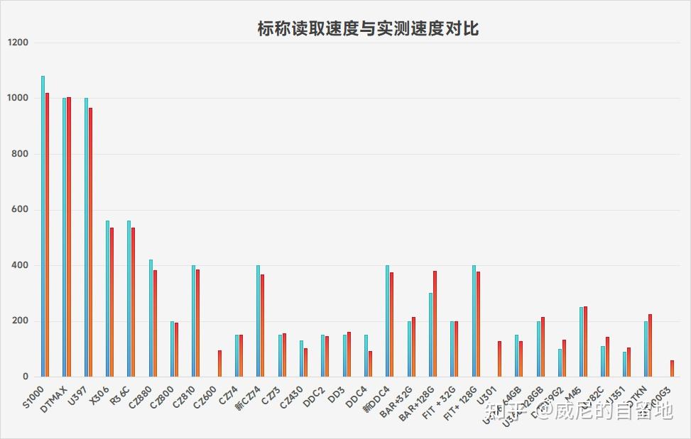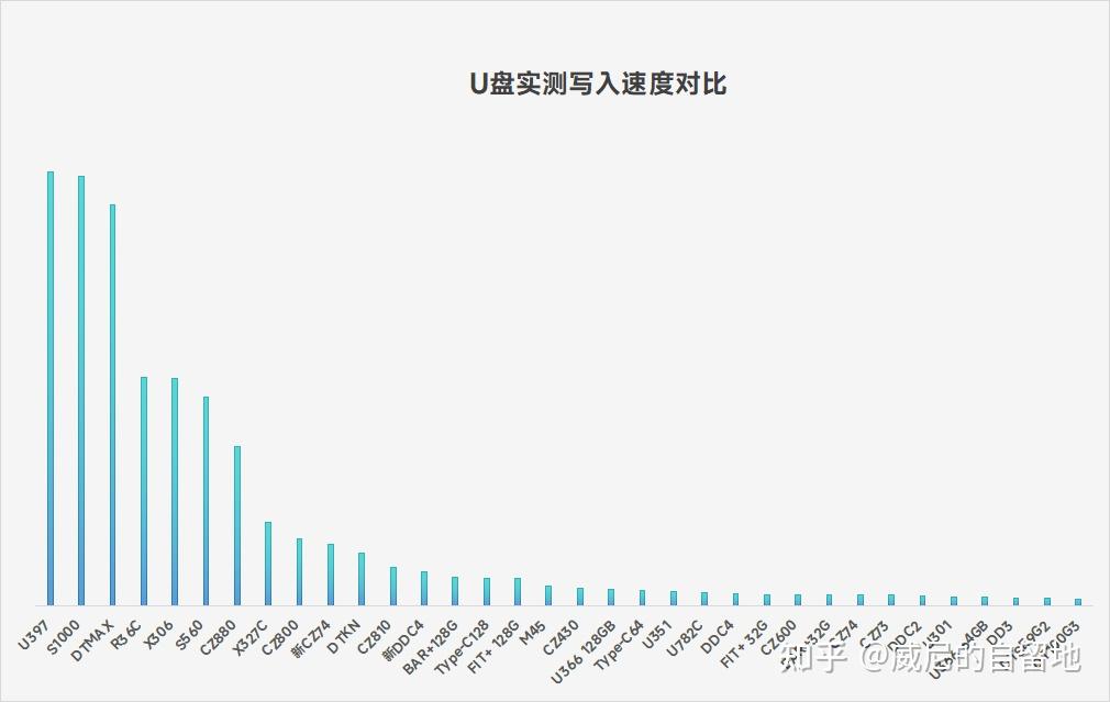 人们买U盘通常是看参数,看标称速度,但标的速度不一定准(能差好多)。我亲自测试的U盘中有几款远远达不到标称的读写速度,也有U盘的实际读写速度超过了标称速度,下面把市场上的主流U盘测试结果逐个说一遍。 PS:本文所有U盘均为自费购买,无任何商业推广,请放心食用;如果只想看好用的U盘,可以直接拉到第四部分。 1、接口有USB2.0、3.0、3.1、3.2等不同标准,买的时候不用太纠结,U盘设计速度与接口是对应的。USB3.0可以支持最大传输度是625MB/s,大多数U盘速度在600MB/s以下,这些U盘虽然写着USB3.2实际上是Gen1(USB3.2的一种),速度和USB3.0几乎 一样;而金士顿DTMAX这种读速1GB/s的U盘通常配雷电或USB3.2 gen2接口,高端移动硬盘则是USB3.2 Gen2×2,所以不用纠结,注意看传输速度、稳定性就行。 如果还有疑问的话,请看下面这篇回答: 接口类型不是影响U盘传输速度的瓶颈,真正影响速度的是主控和闪存。很多生产U盘的厂家,这两个关键零件都要靠外部供应,自己并不生产。 2、做U盘的厂家里,自己能生产闪存颗粒的有闪迪、三星、铠侠,长江存储也有但U盘产品还不成熟。 网上一些小作坊,有的会卖扩容盘,就是看着是512G,实际上是1G经过技术处理做的,买回来后没法用;还有的小作坊U盘用黑片、白片来做,黑片就是检测不合格的,白片就是闪存上没有标产品信息的,都是不合格品,买回来几个月就坏了的一般就是这类货。 所以,我比较推荐买大厂产品,如果可以自产闪存颗粒质量就更有保证了。 3、主控方面绝大多数厂家采用第三方方案,比如:慧荣、擎泰、群联等,像闪迪、海康威视自己做主控,优点是可以针对闪存做优化,速度比较快,但缺点是没有可用的量产工具,坏了就得寄回厂家维修,好在闪迪以换代修、高端U盘还终身质保。第三方方案的好处是有量产工具,只要硬件没有坏,自己就能修好,缺点是质保期短,6年以内,几乎很少见到终身质保的。 主控也有高端、低端之分,不是说自己做的就好、第三方就不好,主要体现在传输速度上。 4、传输速度怎么看? 传输速度分为读取速度和写入速度,一般读速远大于写入,所以有的U盘只标读速,还有的直接写传输速度多少多少,一定要看一下写入速度。 传输速度还分为连续速度和4K速度,连续速度用的比较多,比如拷个电影、音乐、压缩包之类的,就是看连续速度;4K速度一般人用不着,如果拷贝零碎小文件的话有电用,但小文件也远比4K要大,4K主要是直接在U盘上运行程序有用。 下面的测速表里,我把不同大小文件的不同速度都标出来了,到时候自己看就行,上图第一列是文件大小,后面跟着的就是对应的传输速度。 5、U盘容量选多大? 如果不用于临时存储文件、自己有电脑,一般人32G就够用,但是我建议买64G版。 一是要要考虑到U盘升级的问题:现在的视频、图片越来越高清,设计文件也越来越大,尽量买容量大一点的。二是64G比32G贵不了多少,通常1.4倍的样子,不要求速度的话也就是10块钱的差距。三是有的U盘容量大的版本速度快、容量小的速度偏慢。 如果做视频剪辑、设计工作,那可能得买128G了,根据自己的需求来;如果需要512G就不要买U盘了,因为价格太贵,不如买移动硬盘。 买U盘还是移动硬盘?买U盘还有哪些疑问?这篇文章主要是评测,所以不多介绍,请参考我的文章: 1、电脑的几个关键部件 主板:华硕B360I,有2个USB2.0、1个USB3.0、2个USB3.1、1个Type-C接口,可以完全兼容市面上的所有U盘。 硬盘:西数 SN570,实测顺序读速3525.9MB/s,顺序写速2960.3MB/s,远高于市面上所有U盘的读写速度。 备注:为了方便,R36C测试电脑为thinkbook 17 PLUS。 2、测试软件 ATTO Disk Benchmark:闪迪等U盘厂商在实验室测试使用的软件,如果用户的测试结果有异议,厂家往往要求用户用ATTO测试,所以以下U盘的数据均以该软件测试结果为准。 Crystal Disk Mark:为了验证ATTO的偏差,我用Crystal又测试了一遍,两者有明显不同的我会特意说明。 3、测试方法 直接插入主板后接口,不使用主机前接口,不使用显示器接口,目的是验证商家的标称数据是否准确。 先使用ATTO检测,测试完成后立即使用Crystal测试,完成后查看U盘发热情况。 下面是我选择的市场主流U盘,其中有我日常使用的,也有特意买的——市场销量大、知乎上经常推荐的(有些真的没有想象的好用)。 传说中速度快的、卖的好的、知乎推荐的多的、知友评论要求测的我都买来了,又更新了几次,做了几个柱形图,我觉得这样对比更有利于直观的看出U盘的性能。 五个没想到: 标称与实测相比,铠侠、三星居然对测试数据少标(2020年底时参数改成了400MB/s); 金士顿G2、DTKN也比标称速度高了不少; 雷克沙中规中矩,实测数据略微高于标称速度; 一般来说不标速度就代表了速度难看的要命,厂家不敢标;而铠侠U301居然能达到126MB,我的期望值是100MB/s以下,有点出乎想象。 技术实力强、写入速度快、读取速度快的闪迪,大部分没有达到标称速度,所以推荐闪迪需谨慎,使用后才可以。 写入速度上,固态U盘表现极好,尤其是三款写速900MB/s的,曾经的U盘之王CZ880已经落后该出新型号了。 非固态U盘里,海康威视X327C遥遥领先;金士顿DTKN(不稳定,后面详述)、三星紧随其后,金士顿2款U盘垫底,剩下的处于18-27这个范围内。 说明:2020年10月份测试的金士顿DT100G3,但由于ATTO与Crystal两款软件测试数据相差很大,且数据不快,故没有列入统计。 先补个新版CZ74、新版DDC4的表现,本段无