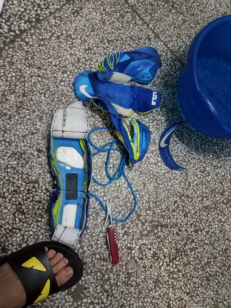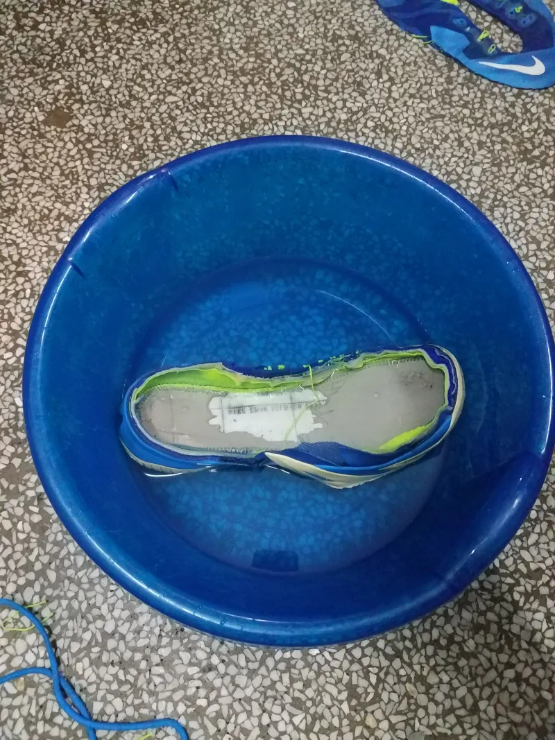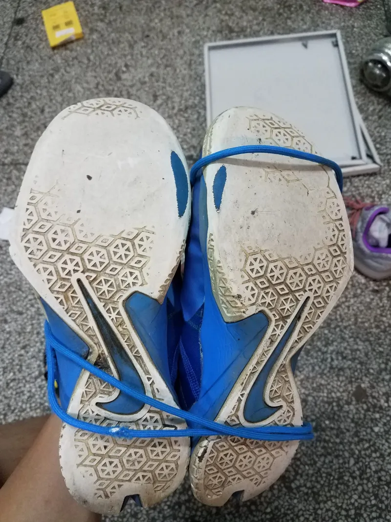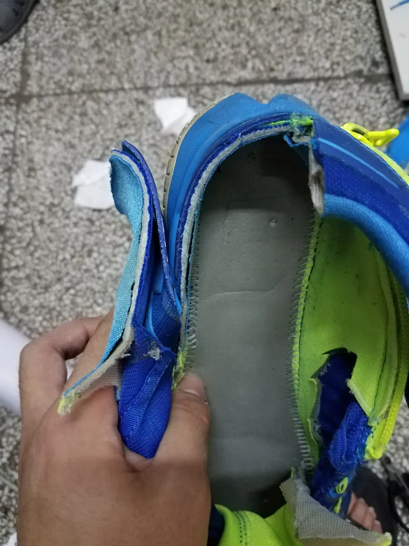 印象中还是一次室外塑胶场后撤步过程中因为前掌好无抓地力滑倒,才让我意识到了这双鞋的寿命已经到了尽头。便有了拆解看看气垫厚度的想法。?先用开水将鞋浸泡了三分钟,方便撕。