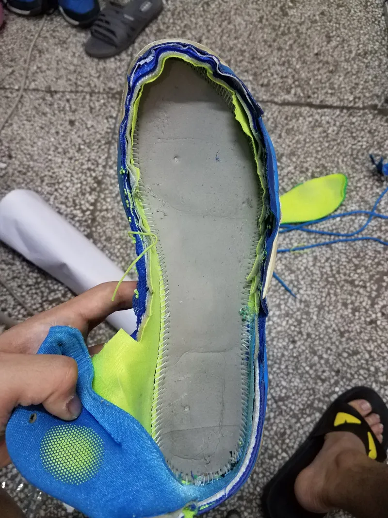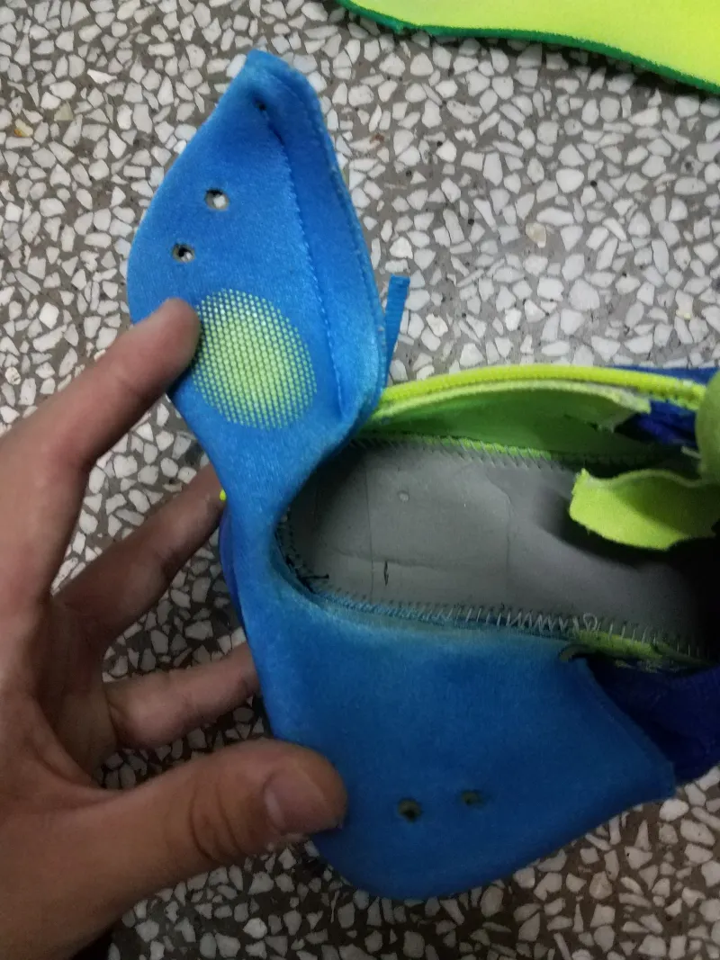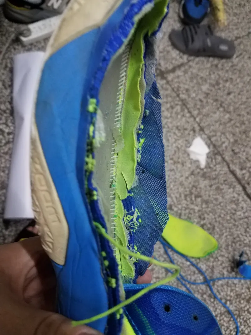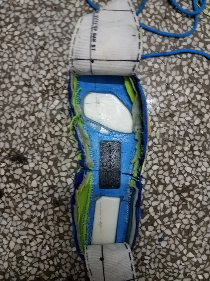 印象中还是一次室外塑胶场后撤步过程中因为前掌好无抓地力滑倒,才让我意识到了这双鞋的寿命已经到了尽头。便有了拆解看看气垫厚度的想法。?先用开水将鞋浸泡了三分钟,方便撕。