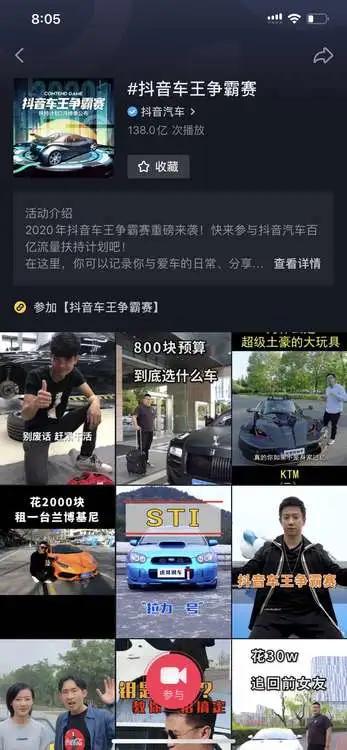 在上半年的“抖音车王争霸赛”活动中,抖音以定向流量扶持等方式,激励作者在“看车、选车、买车、用车、玩车、学车”等内容方向的创作投稿,实现了内容生态丰富性的极大提升,也为用户带来更全面的汽车消费内容,活动多个话题累计播放量超过230亿。