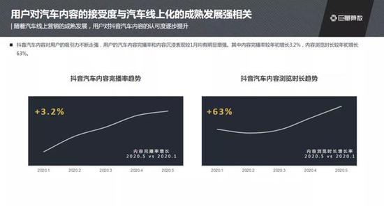 随着更多汽车领域专业创作者来到抖音,以及汽车品牌对抖音重视程度的提升,用户对抖音汽车内容的认可度也在逐步提升。无论是单个视频的完播率,还是内容浏览的总时长,5月较1月数据都有明显增强。