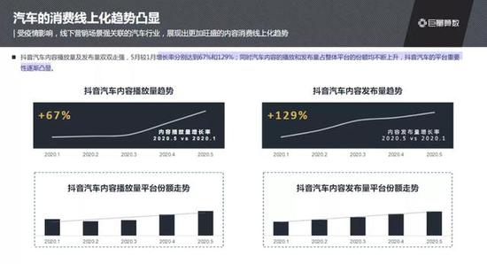 建立在4亿日活跃用户的基础上,抖音汽车内容生态在2020年迎来新高点,一方面释放了人们在特殊时期积累的汽车内容消费需求,另一方面更满足了创作者、汽车品牌及经销商的内容营销诉求。报告显示,抖音汽车内容播放量和发布量5月较1月增长率分别是67%和129%,同时汽车内容的播放和发布量占平台总份额也一路走高。