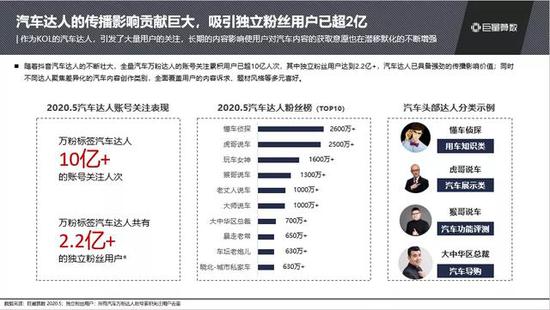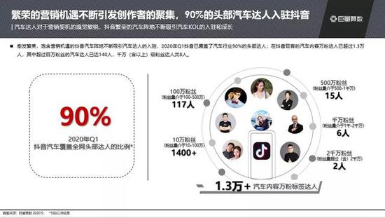 庞大的内容需求,吸引了大批创作者在抖音聚集。2020年Q1,抖音已成功覆盖了90%的汽车行业头部达人,其中8人拥有千万(以上)级粉丝,140人粉丝超过百万。