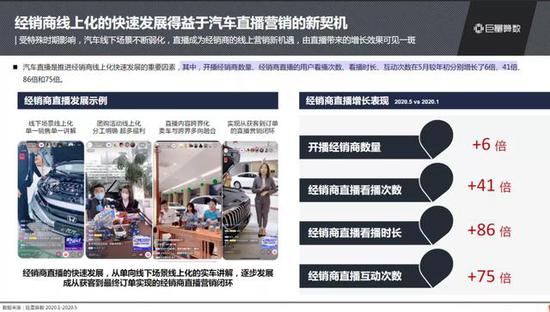 对经销商而言,抖音已成为线上营销的首选核心平台。报告显示,抖音开播的经销商数量、经销商直播的用户看播次数、看播时长、互动次数,在5月较年初分别增长了6倍、41倍、86倍和75倍,实现显著引流,逐步构筑成从获客到最终订单实现的经销商直播营销闭环。