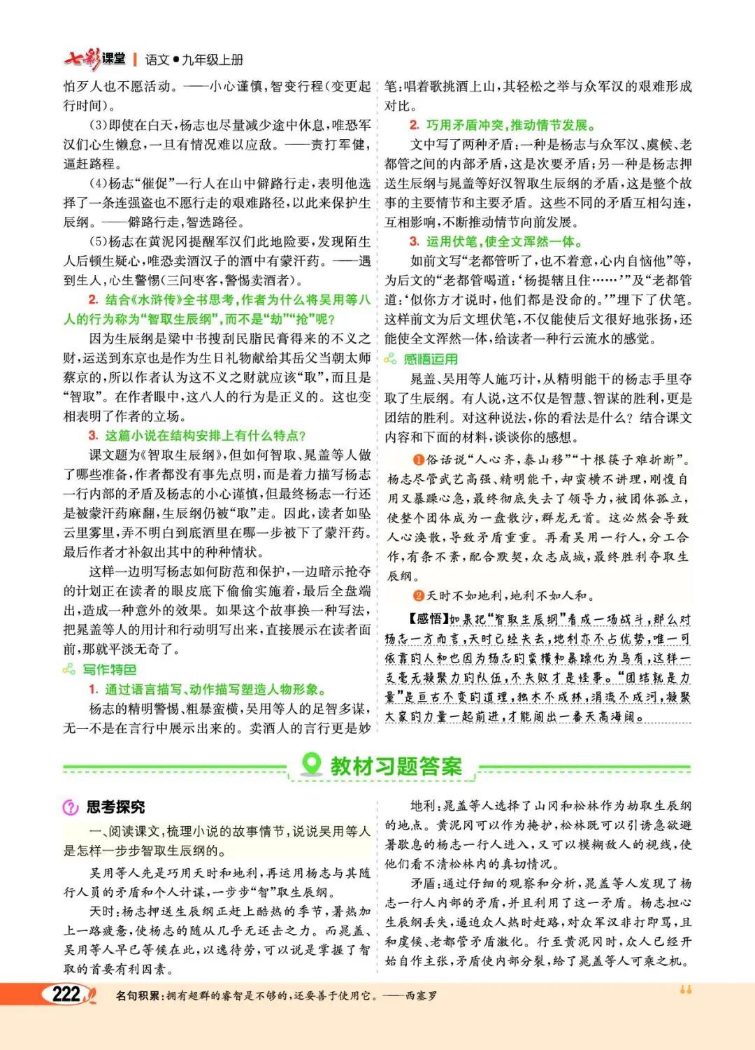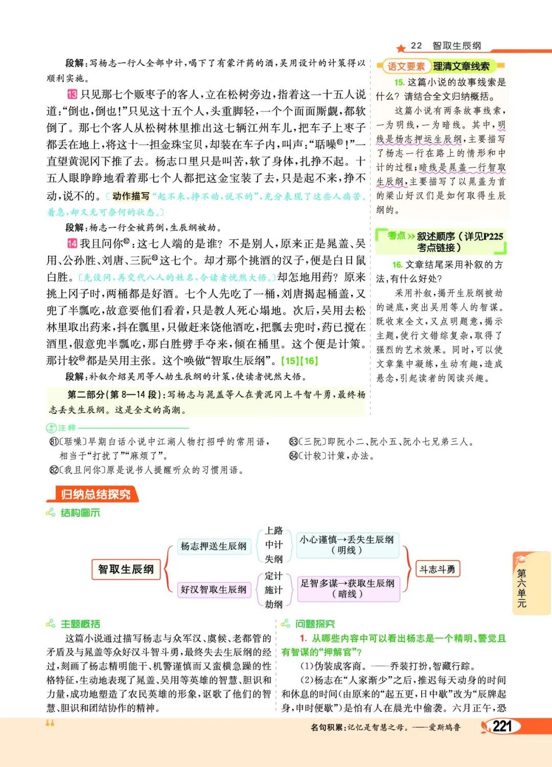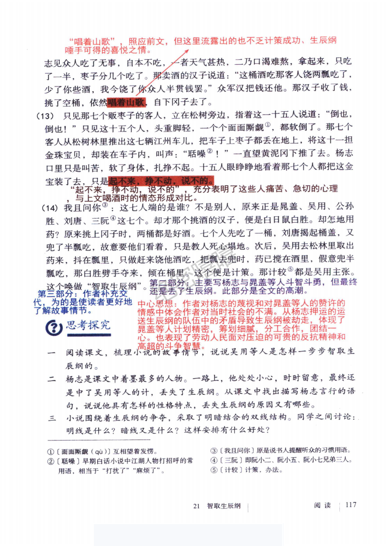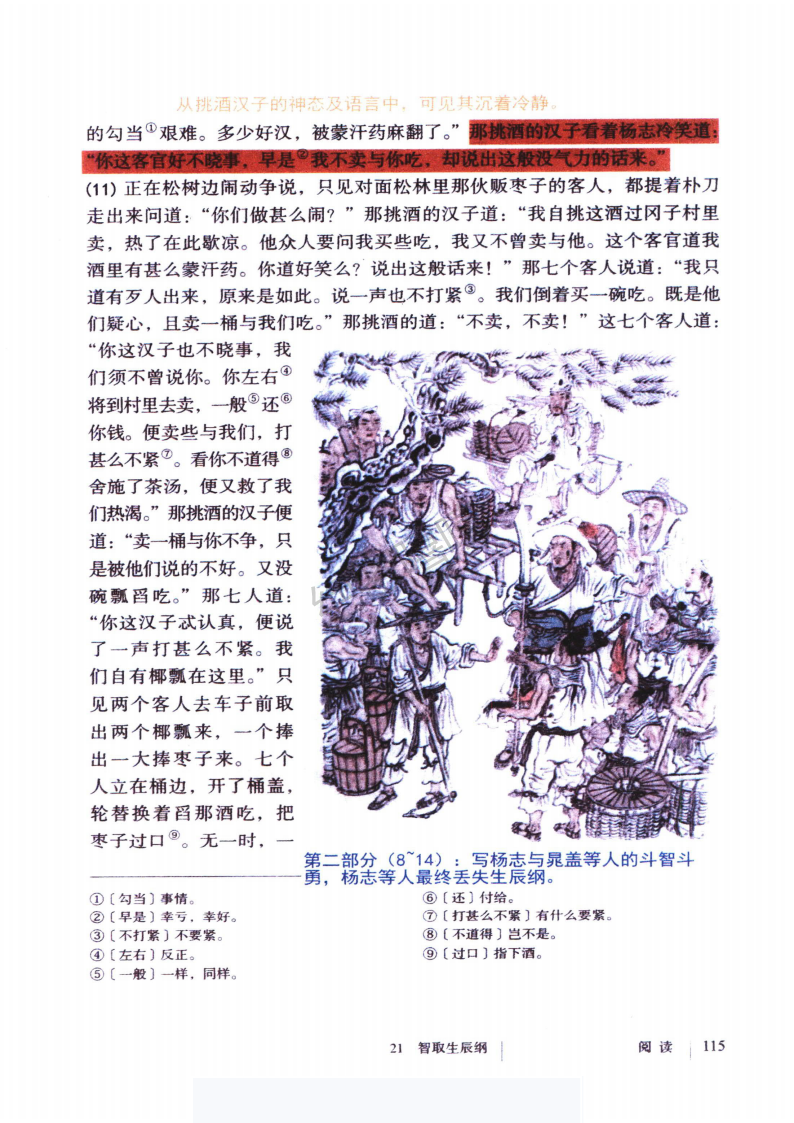 第二部分(5—12):写吴用等人与杨志斗智斗勇,最终智取生辰纲。