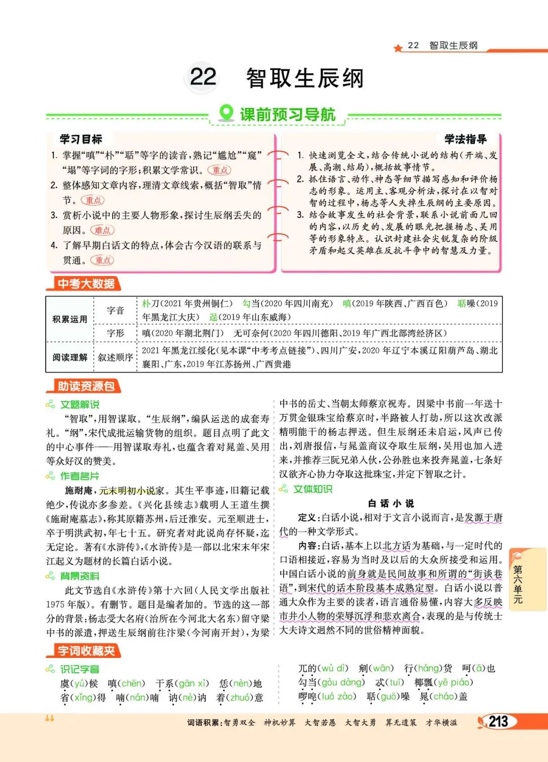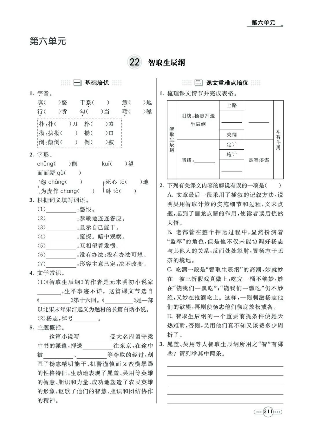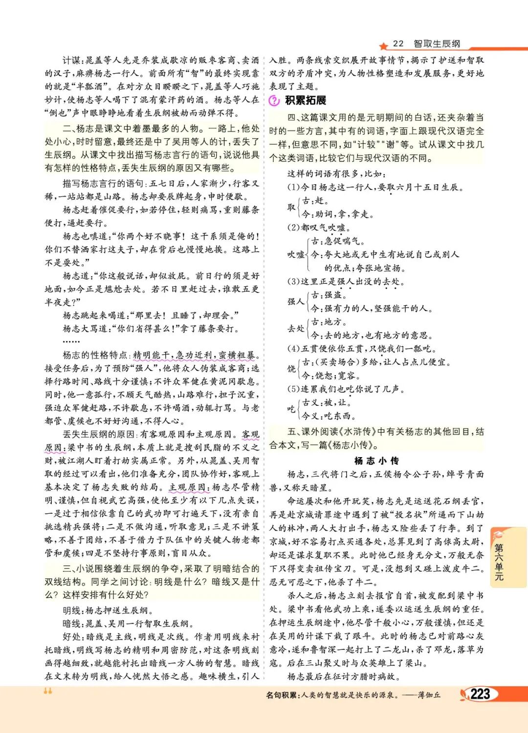 第二部分(5—12):写吴用等人与杨志斗智斗勇,最终智取生辰纲。