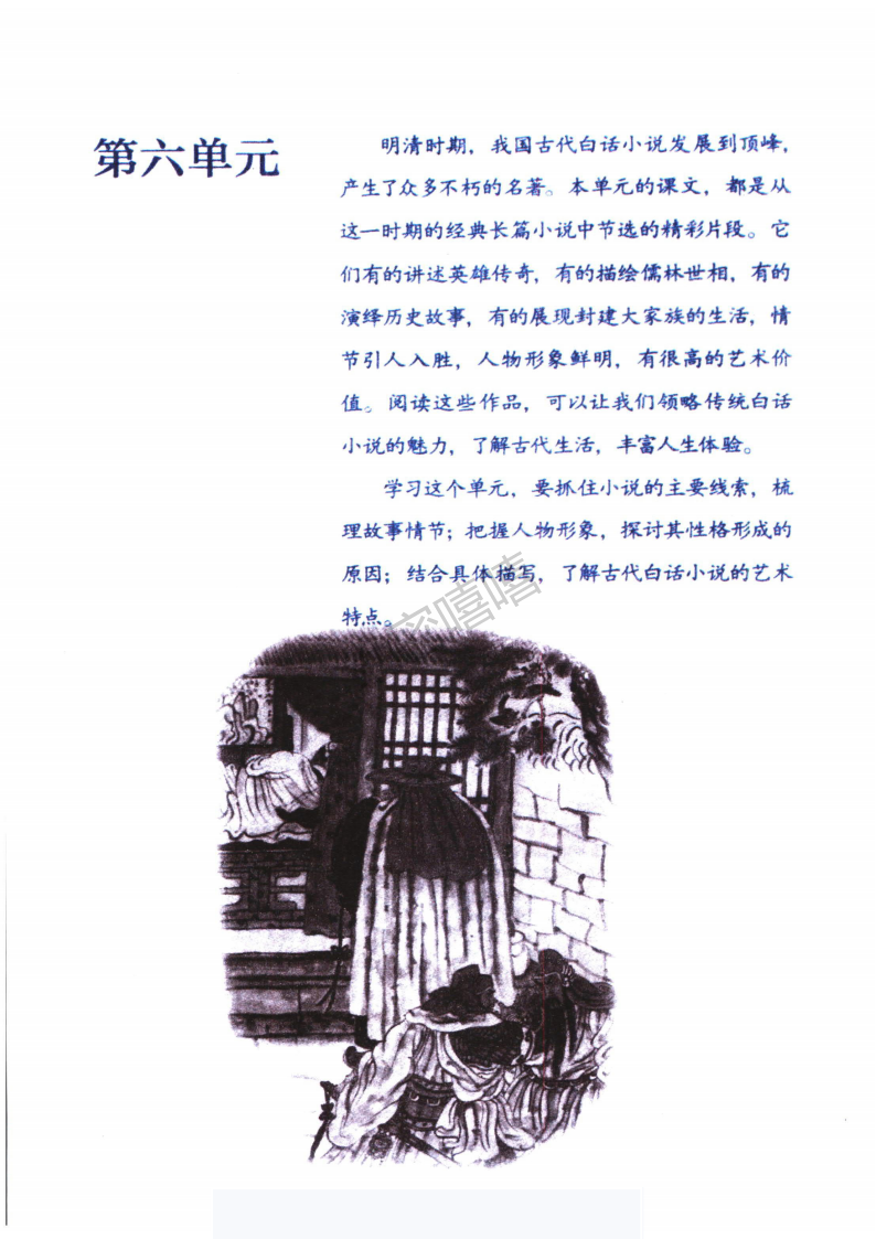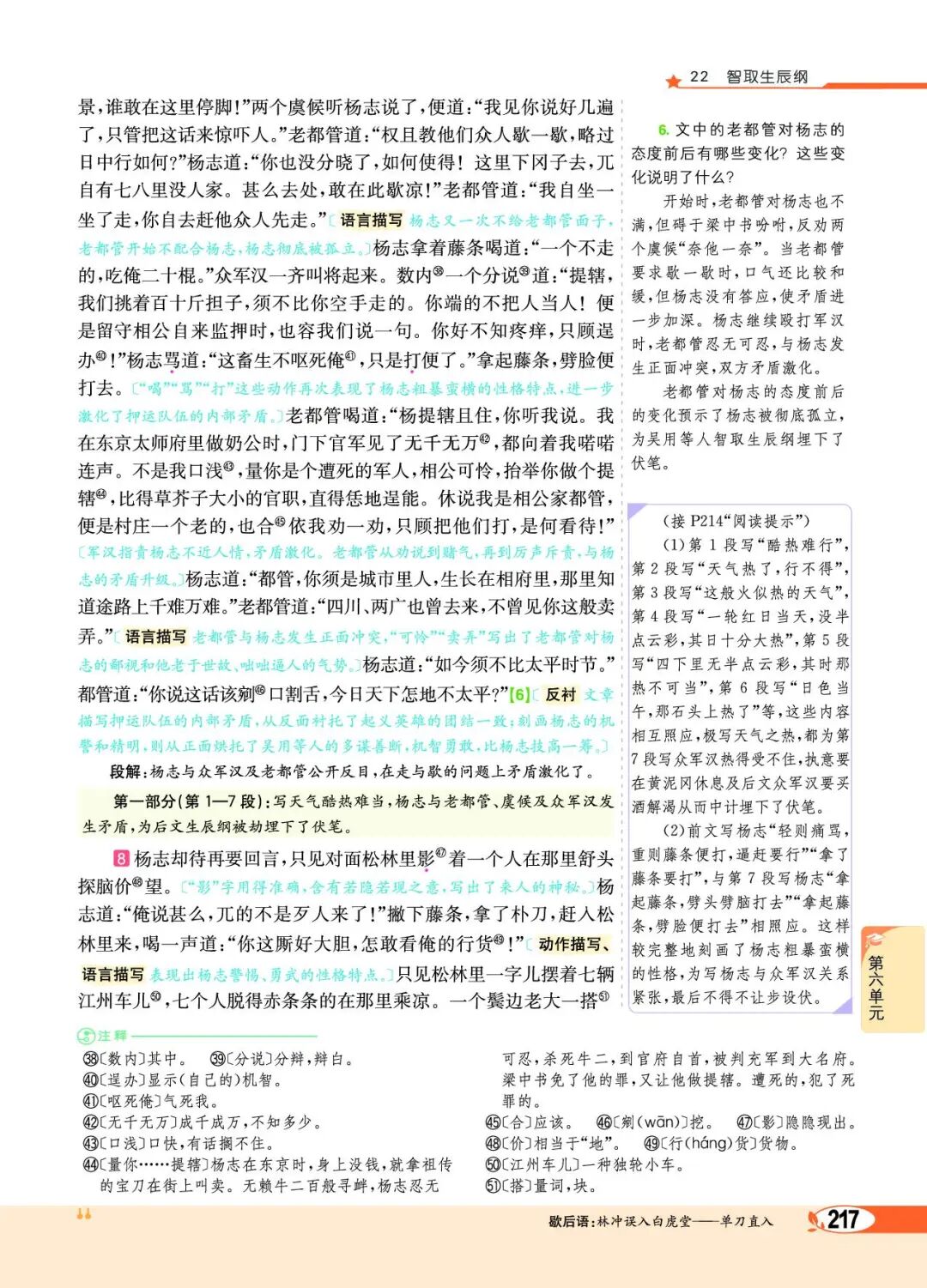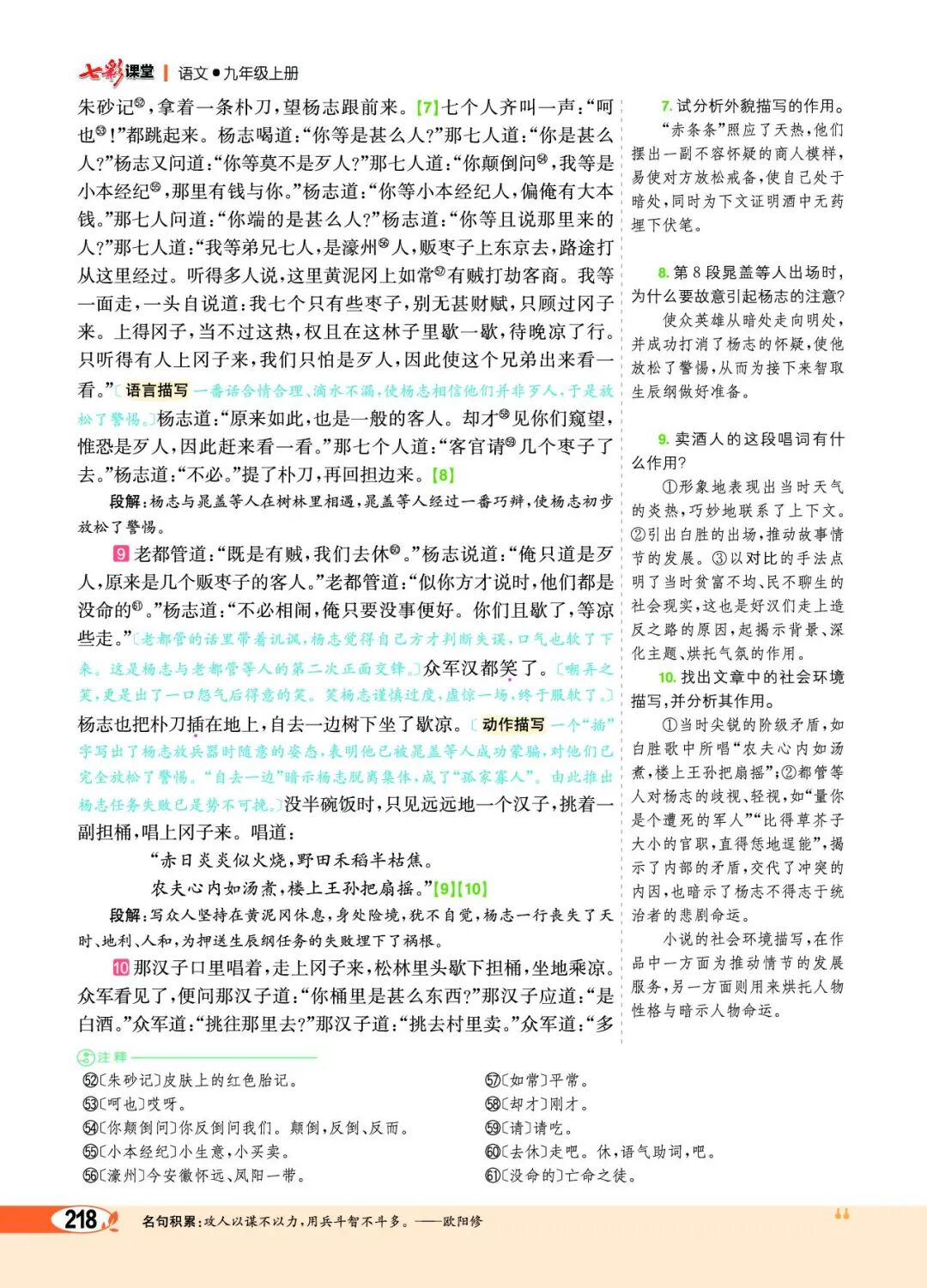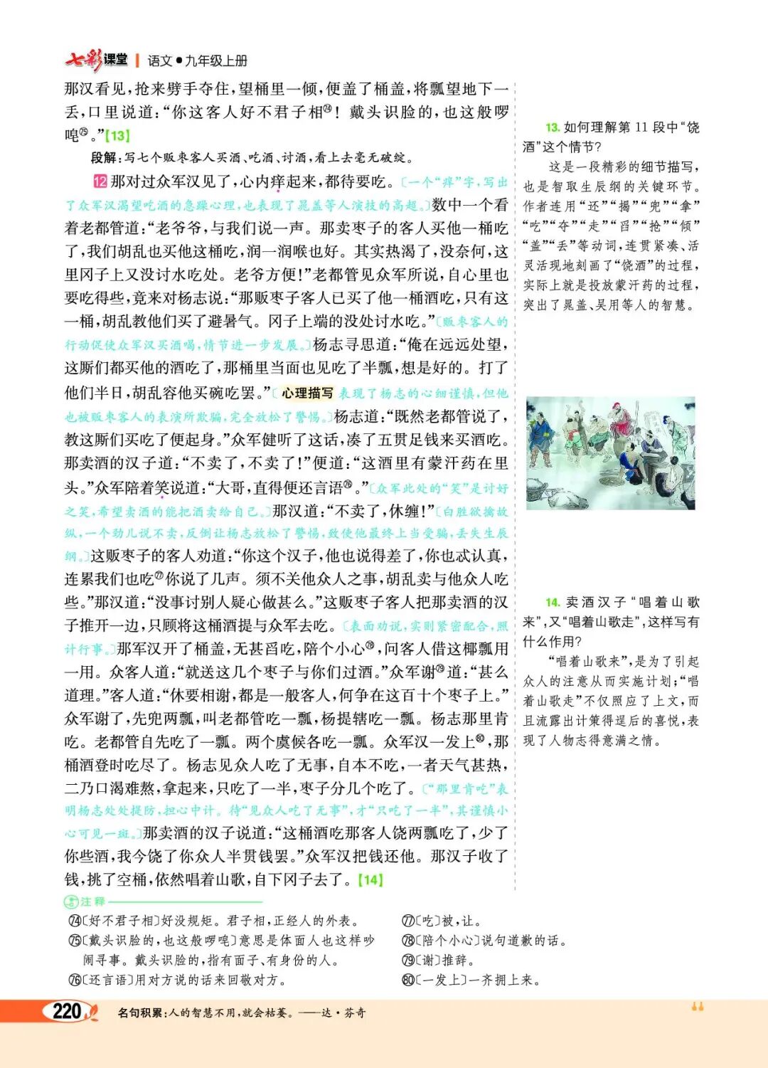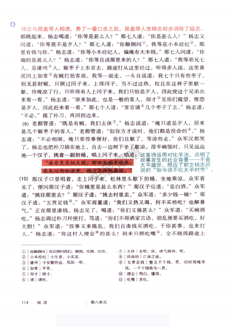第⑦段卖酒人的唱词,目的在于吸引众军汉的注意力,好卖酒行计。这首诗运用对比手法,点明了故事发生的社会背景——不是太平盛世,照应了前文杨志所说的“如今 须不比太平时节”。还暗示了来者不善,使读者更关心情节的发展。在结构上巧妙地联系了上下文,成为课文不可或缺的组成部分,并引出故事的另一个主要人物——白胜。